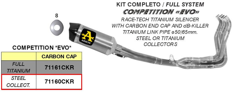 Die Arrow Komplettanlage 71160CKR wurde speziell für die Suzuki GSX-R 1000 (17-23) entwickelt. Diese Hochleistungs-Abgasanlage aus Edelstahl wurde für den Einsatz auf der Rennstrecke konzipiert und bietet durch ihre Leichtbauweise und das verwendete Material erhebliche Vorteile in Leistung und Haltbarkeit. Sie ist mit einem herausnehmbaren DB-Killer ausgestattet, der zusätzliche Flexibilität ermöglicht.