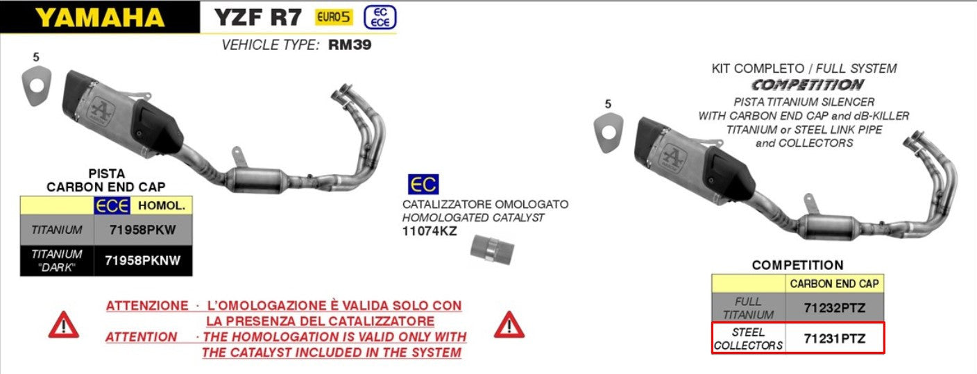 Arrow Komplettanlage Competition (Edelstahl) – Entwickelt für die Yamaha YZF-R7 (21-25), kombiniert die Arrow Komplettanlage 71231PTZ herausragende Leistung, leichtes Gewicht und exklusive Materialien. Perfekt abgestimmt für die Rennstrecke.