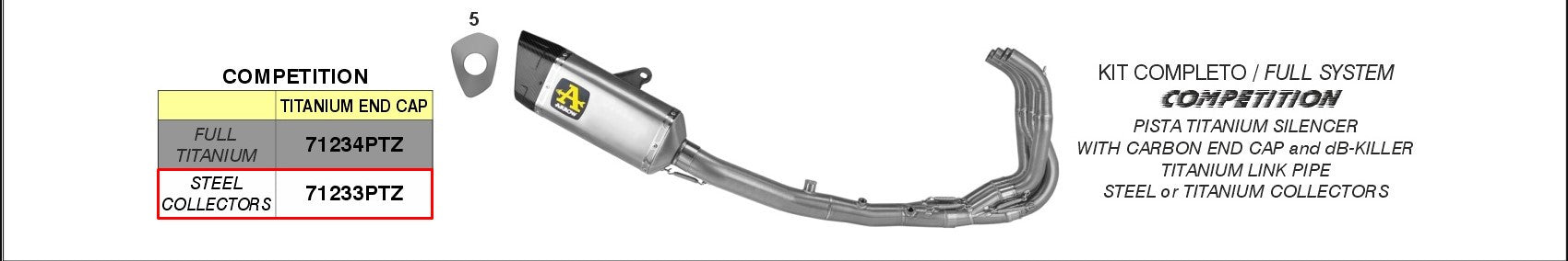 Arrow Komplettanlage Competition (Edelstahl) – Entwickelt für die Kawasaki ZX-4RR (23-25), liefert die Arrow Komplettanlage 71233PTZ maximale Performance für die Rennstrecke. Gefertigt aus hochwertigen Materialien wie Edelstahl, Carbon und Titan, optimiert sie Leistung, Ansprechverhalten und Langlebigkeit. Mit herausnehmbarem DB-Killer und rennerprobtem Design ist sie perfekt für anspruchsvolle Fahrer.