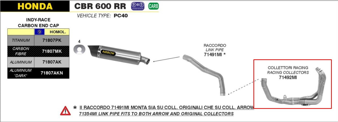 Der Arrow Krümmer 71492MI wurde speziell für die Honda CBR 600 RR (Baujahre 2013-2016) entwickelt und sorgt für eine optimierte Leistungssteigerung und verbesserte Gasannahme. Dieser Edelstahl-Krümmer lässt sich sowohl mit dem originalen Endschalldämpfer als auch mit verschiedenen Arrow Slip-Ons (z. B. 71807) und dem Verbindungsrohr (71491MI) kombinieren, um eine leistungsstarke Komplettanlage zu erstellen. Für optimale Leistung und Langlebigkeit wird ein speziell entwickeltes Mapping empfohlen.