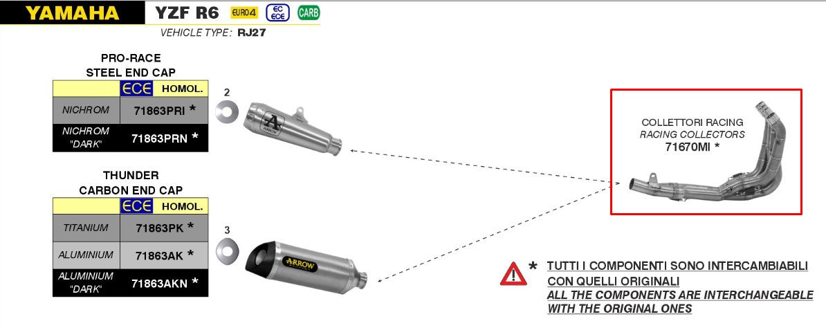 Der Arrow Krümmer 71670MI wurde speziell für die Yamaha YZF-R6 RJ27 (Baujahre 2017-2025) entwickelt und sorgt für eine optimierte Leistungssteigerung und eine verbesserte Gasannahme. Dieser Edelstahl-Krümmer trägt zur Gesamtperformance bei und ist für den Rennstreckenbetrieb konzipiert. Für eine optimale Leistung und Langlebigkeit wird eine speziell entwickelte Neuprogrammierung des Steuergeräts empfohlen.