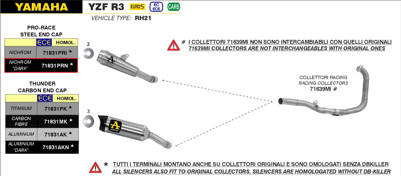 Das erste Beispielbild wurde gephotoshopt, da Arrow noch kein Produktbild für die Yamaha YZF-R3 zur Verfügung stellt. Das tatsächliche Produkt entspricht jedoch den hier beschriebenen Spezifikationen.