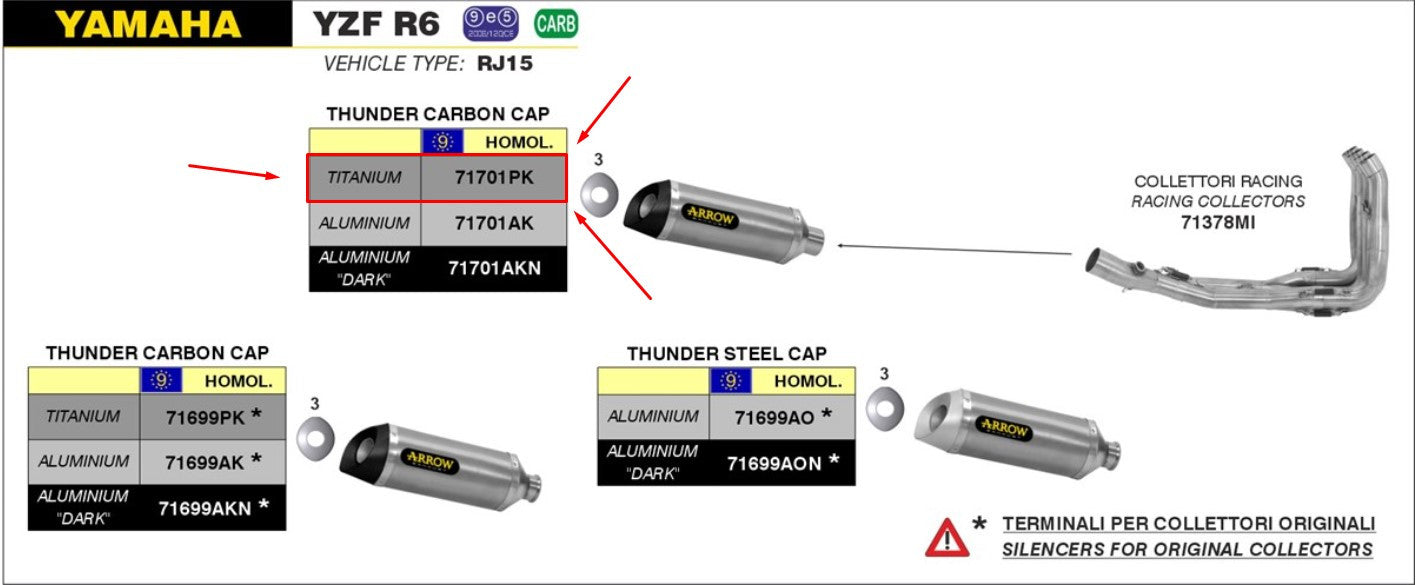 Der Arrow Slip-On Thunder Titanium 71701PK für die Yamaha YZF-R6 RJ15 (2008-2016) ist die perfekte Wahl für Fahrer, die auf maximale Leistung, sportliche Optik und langfristige Haltbarkeit setzen. Mit den Carbon-Endkappen und dem Titanium-Endschalldämpfer erhältst du nicht nur eine verbesserte Leistung, sondern auch eine sportliche Optik und eine langlebige Lösung für deine Yamaha YZF-R6. Bestelle noch heute und erlebe die Vorteile des Arrow Slip-On Thunder Titanium in Kombination mit den Arrow Krümmern 71378MI oder 71473MI!
