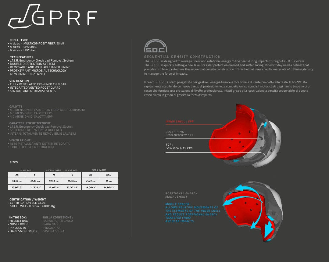 Der J-GPRF ist von Just1 der innovativster Helm, speziell entwickelt für Straße und Rennsport. Mit dem S.D.C.-System (Sequential Density Construction) bietet er optimalen Schutz vor linearen und rotierenden Kräften bei Aufprällen. Materialien mit unterschiedlichen Dichten absorbieren die Energie gezielt, um den Kopf bestmöglich zu schützen.