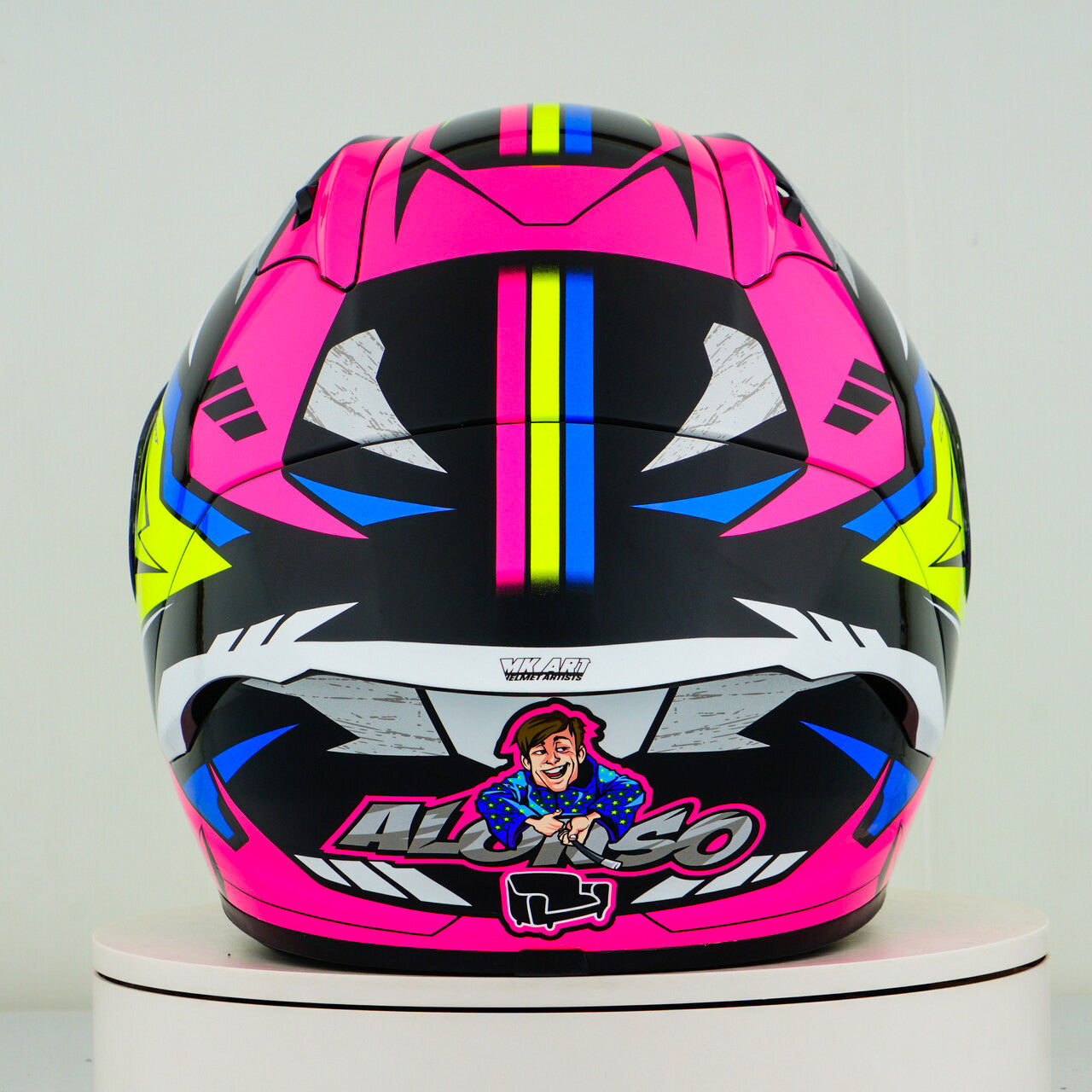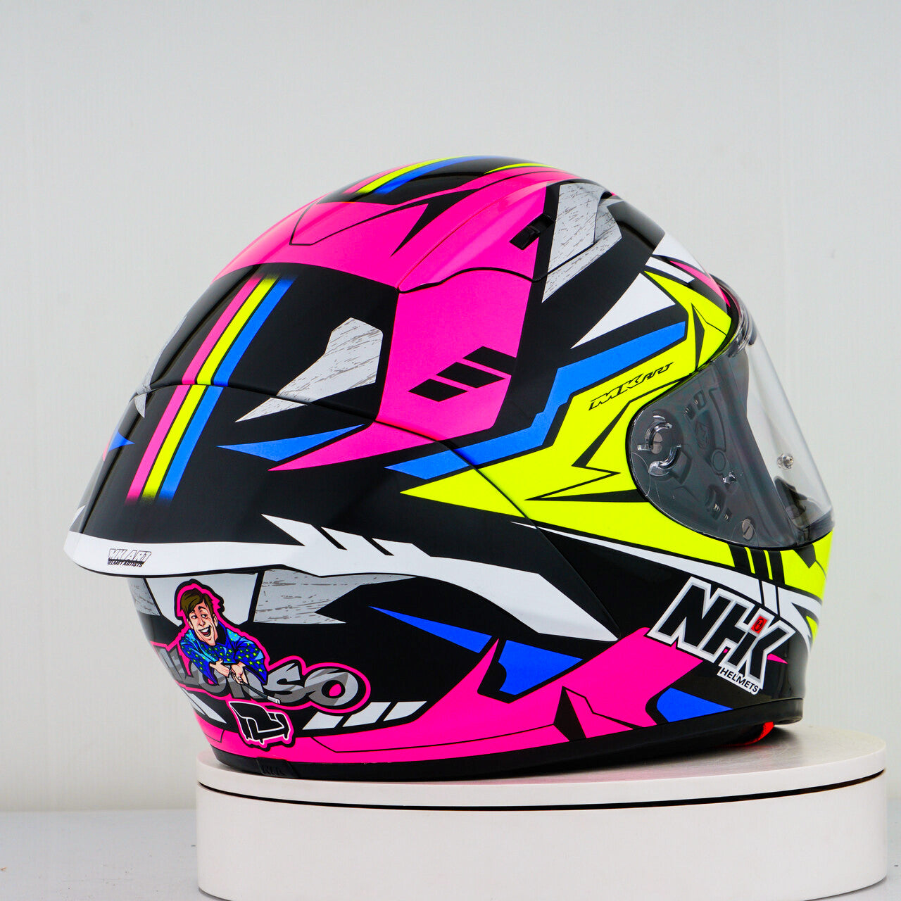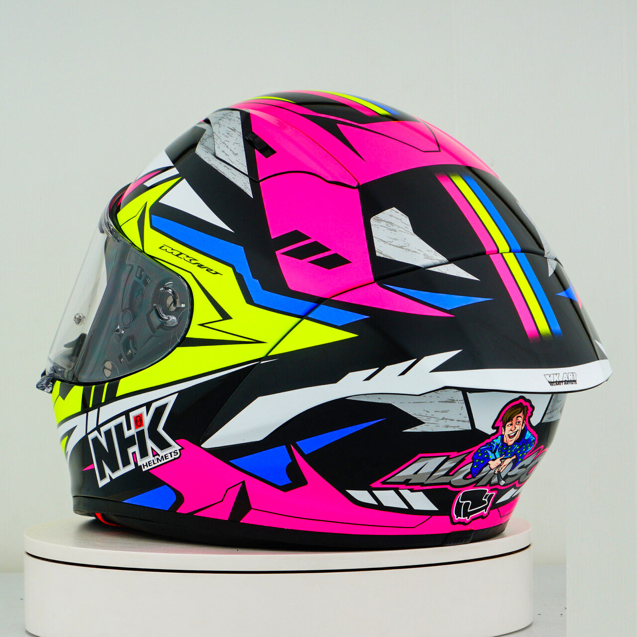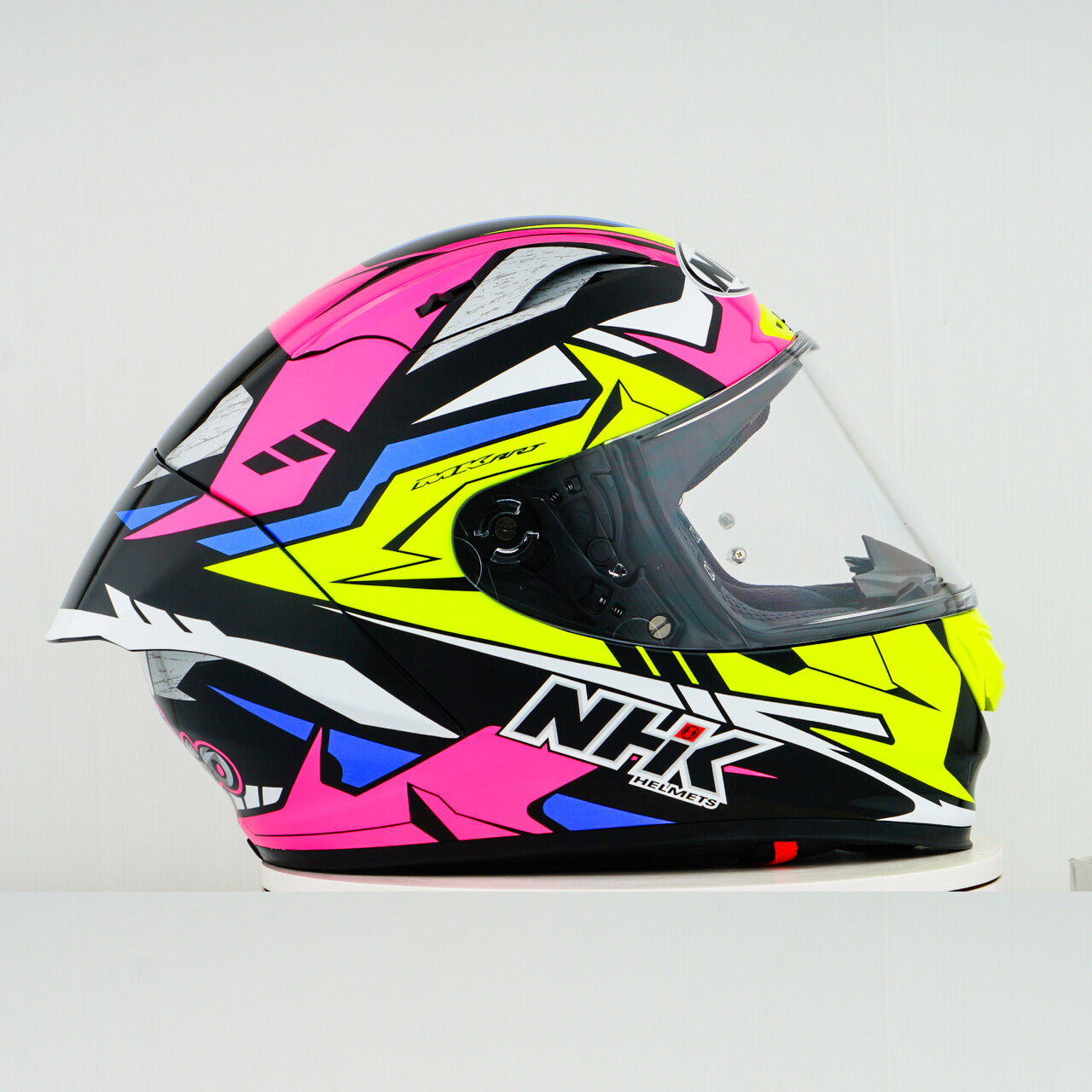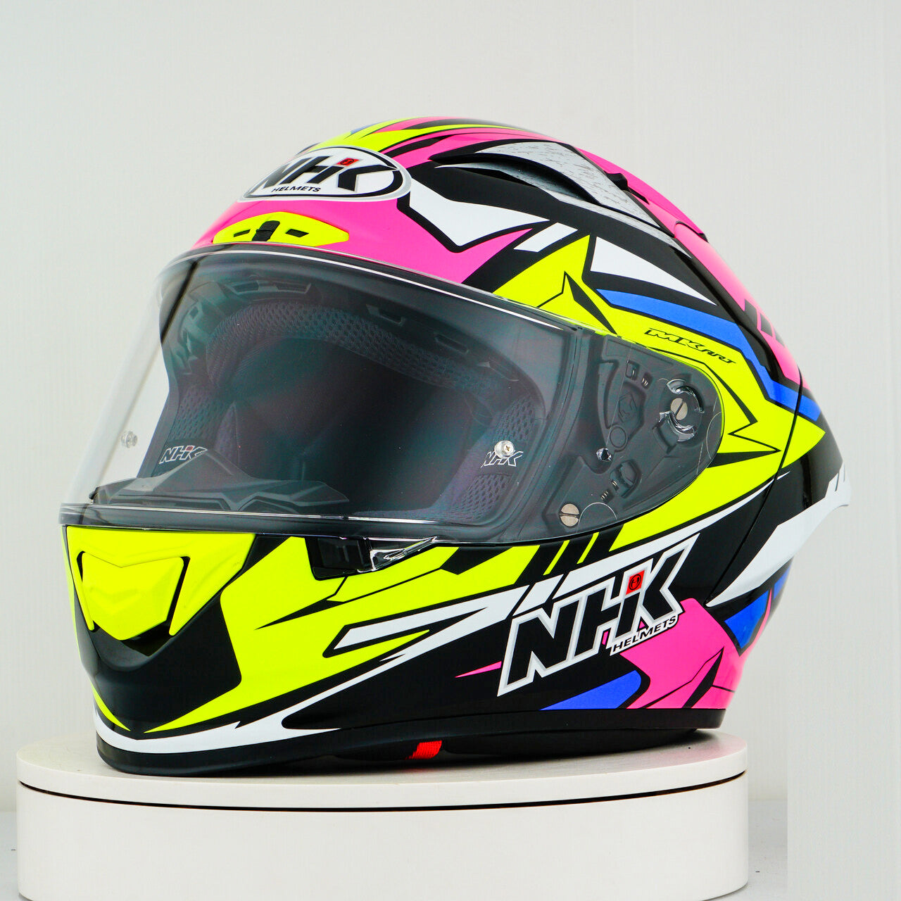 Ervaar de ultieme motorhelm met de NHK GP-R Tech Race, die FIM-goedgekeurd is en een (AFRC) Advanced Fiberglass Reinforced Composite-schaal biedt in vijf maten, die perfecte pasvorm en bescherming garandeert. De AFRC is een composietmateriaal dat bestaat uit een matrix en versterkingsvezels. De matrix is meestal een polymeer (bijv. epoxy), terwijl de versterkingsvezels van glasvezels zijn gemaakt. Met negen binnenschaalmaten en twaalf helm maten vindt u altijd de ideale pasvorm. Ons 4D-Air ventilatiesysteem zorgt voor optimale ventilatie en een comfortabel draaggevoel, terwijl de premium en comfortabele voering het hoogste comfort biedt. De helm is aerodynamisch getest in de klassen van de MotoGP en heeft een vlak vizier met "Wide Angle View" voor een uitgebreid gezichtsveld. Het Pin-Lock & Tear-off-ready vizier garandeert een helder zicht onder alle omstandigheden. Dankzij het 100% volledig mechanische viziersysteem is het verwisselen van het vizier eenvoudig en snel. De uitneembare en wasbare voering zorgt voor eenvoudige verzorging en hygiëne. De helm is bovendien voorbereid voor een "Camel-Bag" en kan probleemloos met een bril worden gedragen. Het dubbele D-ring bevestigingssysteem en de wang voor noodontname bieden extra veiligheid en stabiliteit. De helm is in de windtunnel getest om de beste prestaties bij hoge snelheid te garanderen.