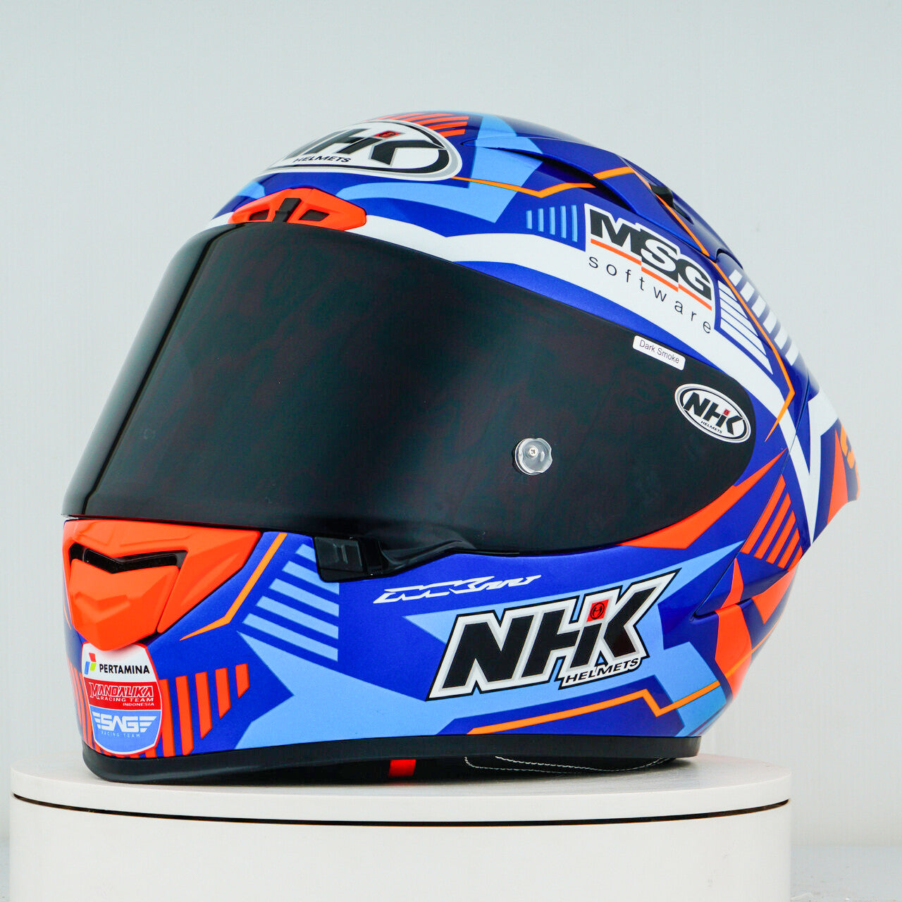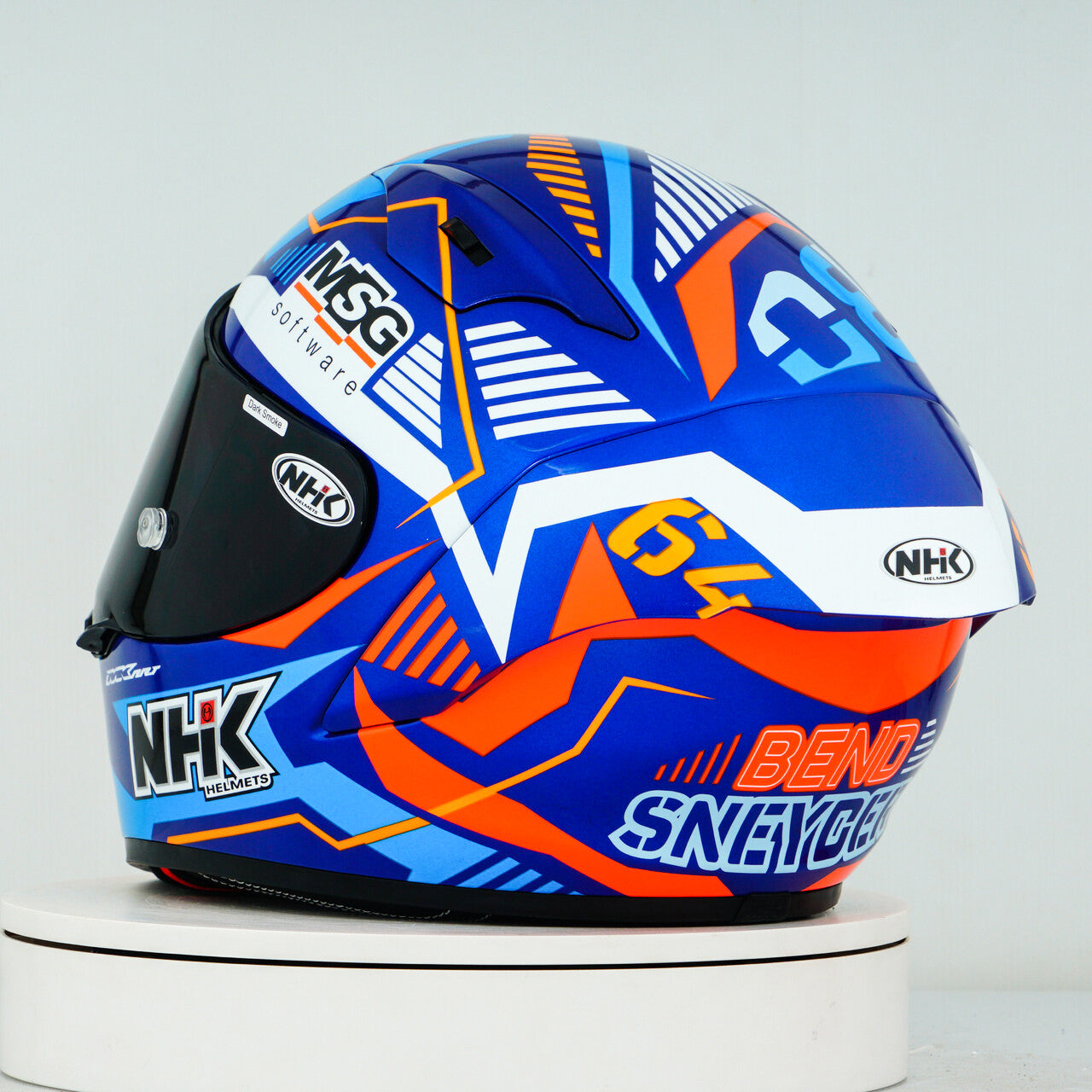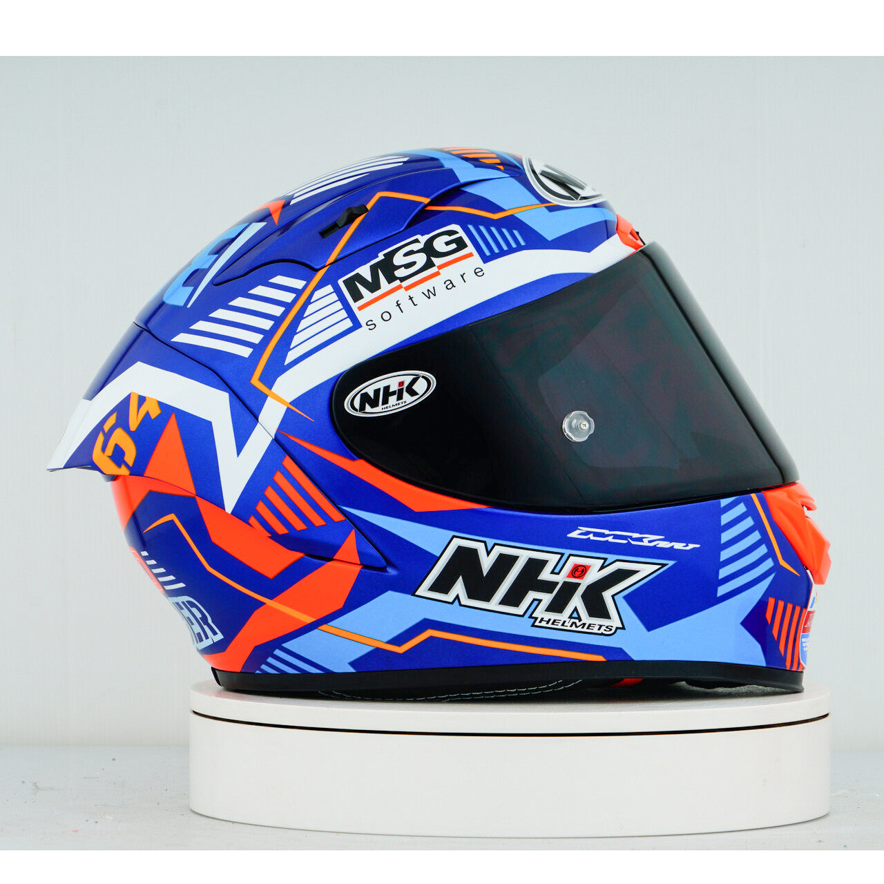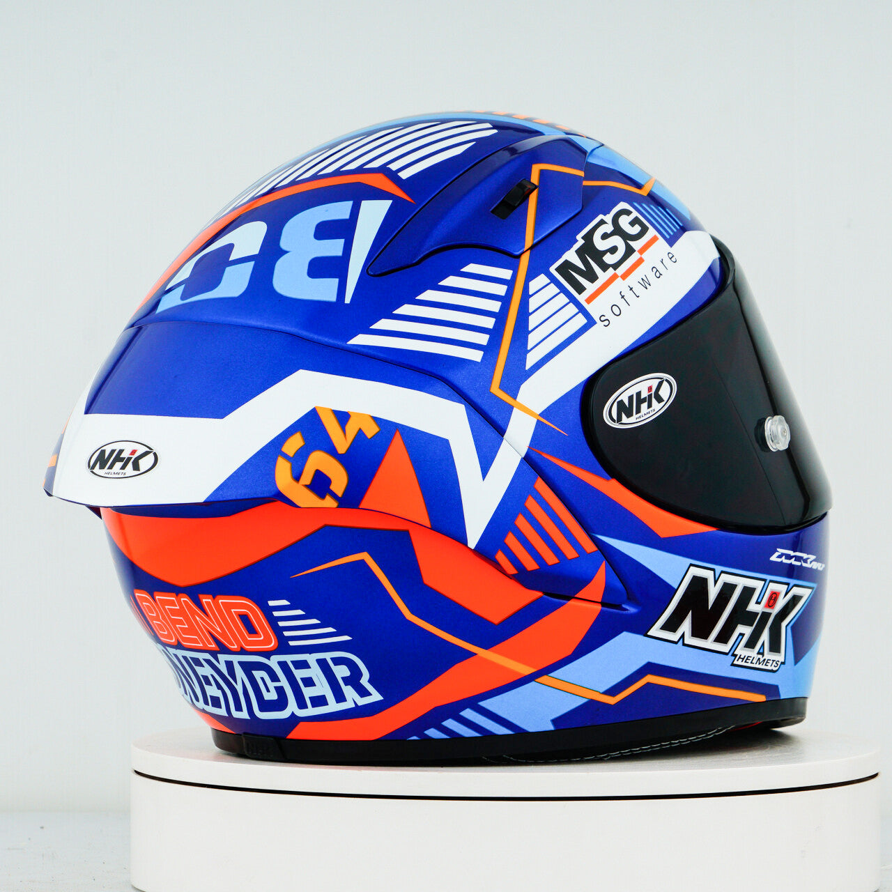 Erleben Sie den ultimativen Motorradhelm mit dem NHK GP-R Tech Race, der FIM-zugelassen ist und eine (AFRC) Advanced Fiberglass Reinforced Composite-Verbundschale in fünf Größen bietet, die perfekte Passform und Schutz garantiert. Der AFRC ist ein Verbundwerkstoff, der aus einer Matrix und Verstärkungsfasern besteht. Die Matrix ist in der Regel ein Polymer (z. B. Epoxidharz), während die Verstärkungsfasern aus Glasfasern bestehen. Mit neun Innenschalengrößen und zwölf Helmgrößen finden Sie immer die ideale Passform. Unser 4D-Air Lüftungssystem sorgt für eine optimale Belüftung und ein angenehmes Tragegefühl, während das Premium und komfortable Innenfutter höchsten Komfort bietet. Der Helm wurde aerodynamisch in den Klassen der MotoGP getestet und verfügt über ein flaches Visier mit "Wide Angle View" für ein erweitertes Sichtfeld. Das Pin-Lock & Tear-off-ready Visier gewährleistet klare Sicht unter allen Bedingungen. Dank des 100% vollmechanischen Visiersystems ist der Wechsel des Visiers einfach und schnell. Das herausnehmbare und waschbare Innenfutter sorgt für einfache Pflege und Hygiene. Der Helm ist zudem vorbereitet für einen "Camel-Bag" und kann problemlos mit Brille getragen werden. Das Doppel-D-Ring-Rückhaltesystem und die Wange zur Notabnahme bieten zusätzliche Sicherheit und Stabilität. Der Helm wurde im Windkanal getestet, um beste Leistung bei hoher Geschwindigkeit zu gewährleisten.