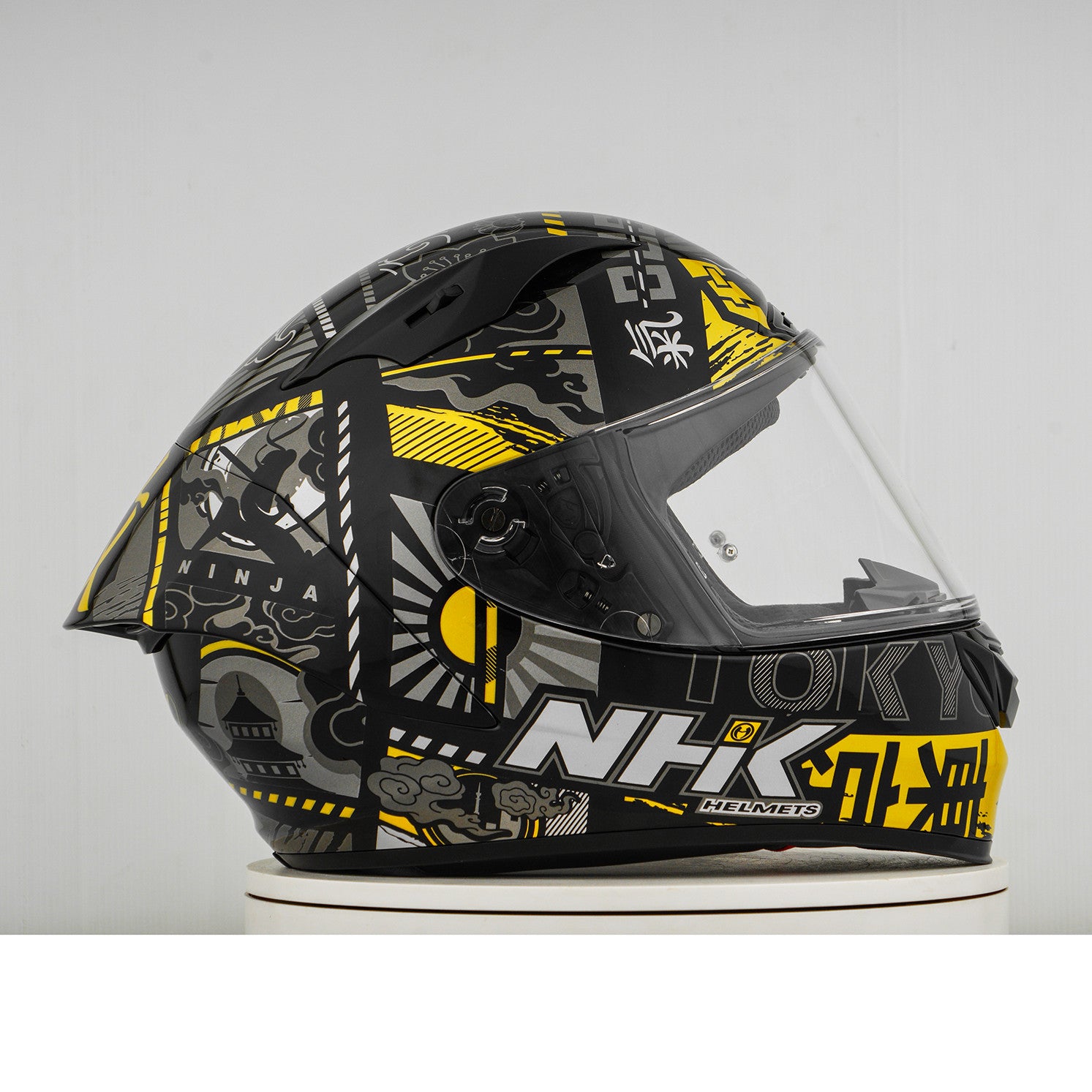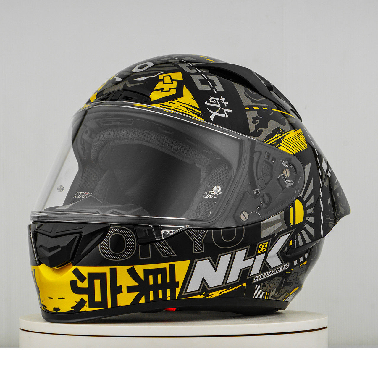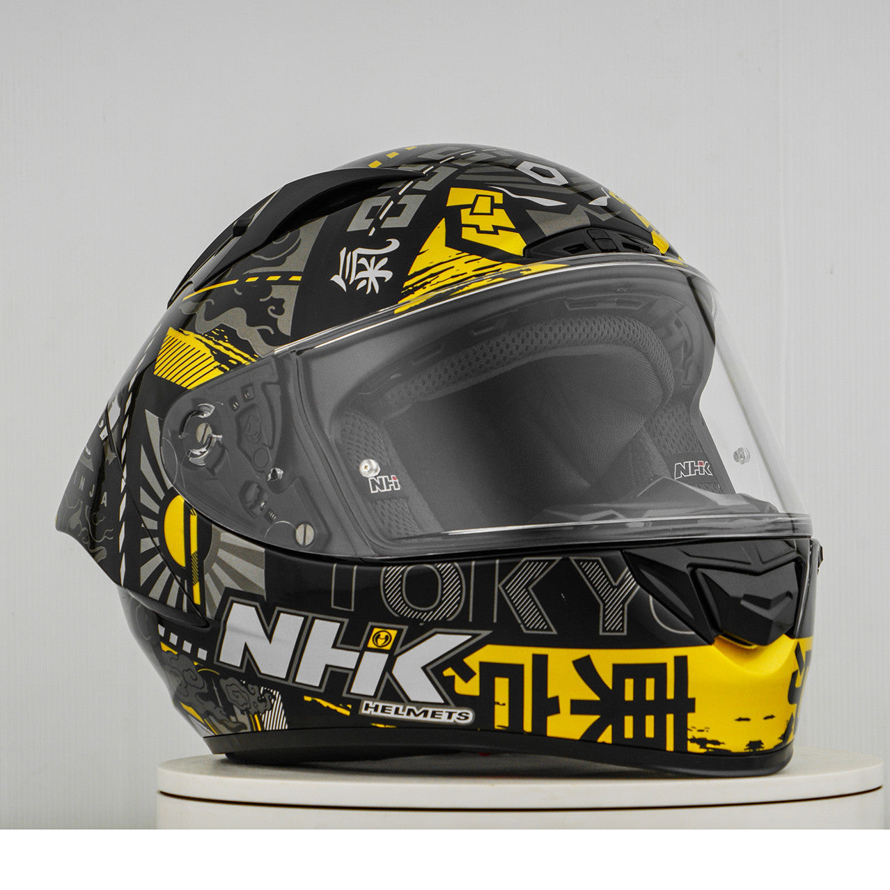 Erleben Sie den ultimativen Motorradhelm mit dem NHK GP-R Tech Race, der FIM-zugelassen ist und eine (AFRC) Advanced Fiberglass Reinforced Composite-Verbundschale in fünf Größen bietet, die perfekte Passform und Schutz garantiert. Der AFRC ist ein Verbundwerkstoff, der aus einer Matrix und Verstärkungsfasern besteht. Die Matrix ist in der Regel ein Polymer (z. B. Epoxidharz), während die Verstärkungsfasern aus Glasfasern bestehen. Mit neun Innenschalengrößen und zwölf Helmgrößen finden Sie immer die ideale Passform. Unser 4D-Air Lüftungssystem sorgt für eine optimale Belüftung und ein angenehmes Tragegefühl, während das Premium und komfortable Innenfutter höchsten Komfort bietet. Der Helm wurde aerodynamisch in den Klassen der MotoGP getestet und verfügt über ein flaches Visier mit "Wide Angle View" für ein erweitertes Sichtfeld. Das Pin-Lock & Tear-off-ready Visier gewährleistet klare Sicht unter allen Bedingungen. Dank des 100% vollmechanischen Visiersystems ist der Wechsel des Visiers einfach und schnell. Das herausnehmbare und waschbare Innenfutter sorgt für einfache Pflege und Hygiene. Der Helm ist zudem vorbereitet für einen "Camel-Bag" und kann problemlos mit Brille getragen werden. Das Doppel-D-Ring-Rückhaltesystem und die Wange zur Notabnahme bieten zusätzliche Sicherheit und Stabilität. Der Helm wurde im Windkanal getestet, um beste Leistung bei hoher Geschwindigkeit zu gewährleisten.