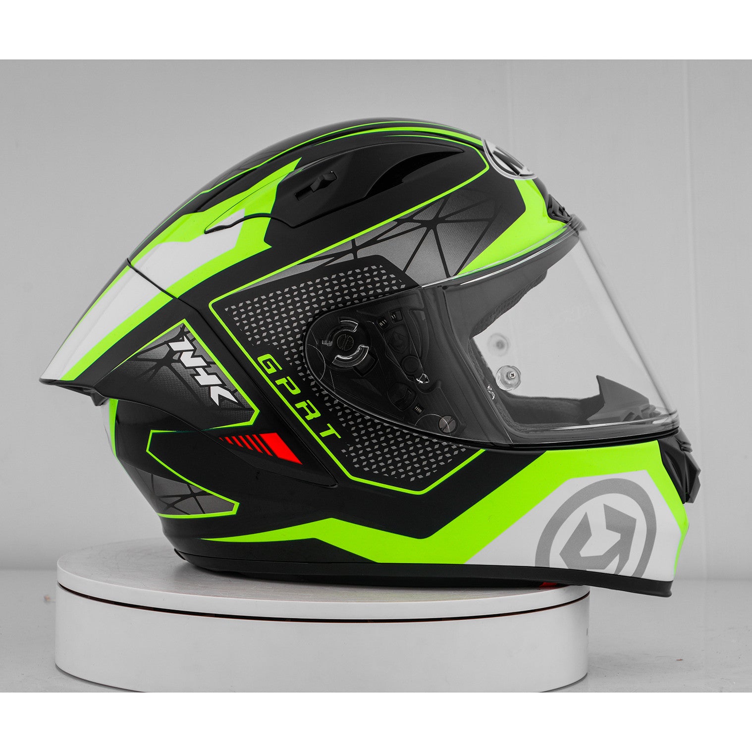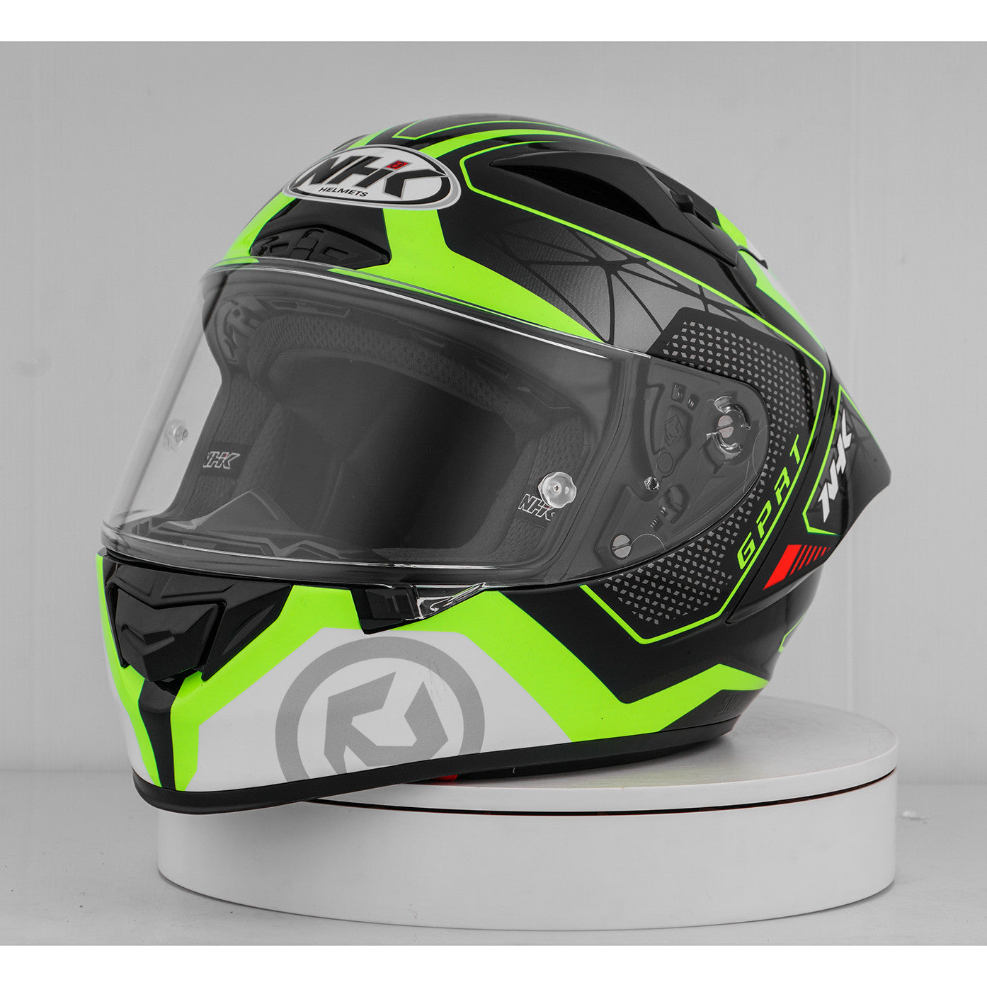 Erleben Sie den ultimativen Motorradhelm mit dem NHK GP-R Tech Race, der FIM-zugelassen ist und eine (AFRC) Advanced Fiberglass Reinforced Composite-Verbundschale in fünf Größen bietet, die perfekte Passform und Schutz garantiert. Der AFRC ist ein Verbundwerkstoff, der aus einer Matrix und Verstärkungsfasern besteht. Die Matrix ist in der Regel ein Polymer (z. B. Epoxidharz), während die Verstärkungsfasern aus Glasfasern bestehen. Mit neun Innenschalengrößen und zwölf Helmgrößen finden Sie immer die ideale Passform. Unser 4D-Air Lüftungssystem sorgt für eine optimale Belüftung und ein angenehmes Tragegefühl, während das Premium und komfortable Innenfutter höchsten Komfort bietet.Der Helm wurde aerodynamisch in den Klassen der MotoGP getestet und verfügt über ein flaches Visier mit "Wide Angle View" für ein erweitertes Sichtfeld. Das Pin-Lock & Tear-off-ready Visier gewährleistet klare Sicht unter allen Bedingungen. Dank des 100% vollmechanischen Visiersystems ist der Wechsel des Visiers einfach und schnell.Das herausnehmbare und waschbare Innenfutter sorgt für einfache Pflege und Hygiene. Der Helm ist zudem vorbereitet für einen "Camel-Bag" und kann problemlos mit Brille getragen werden. Das Doppel-D-Ring-Rückhaltesystem und die Wange zur Notabnahme bieten zusätzliche Sicherheit und Stabilität. Der Helm wurde im Windkanal getestet, um beste Leistung bei hoher Geschwindigkeit zu gewährleisten.