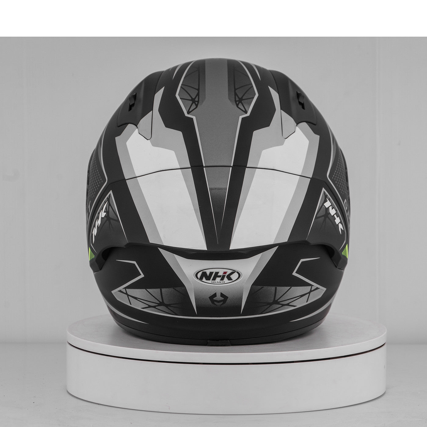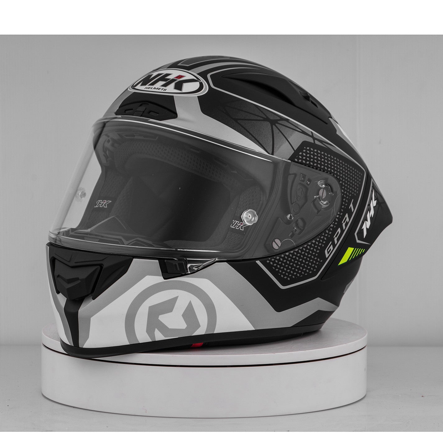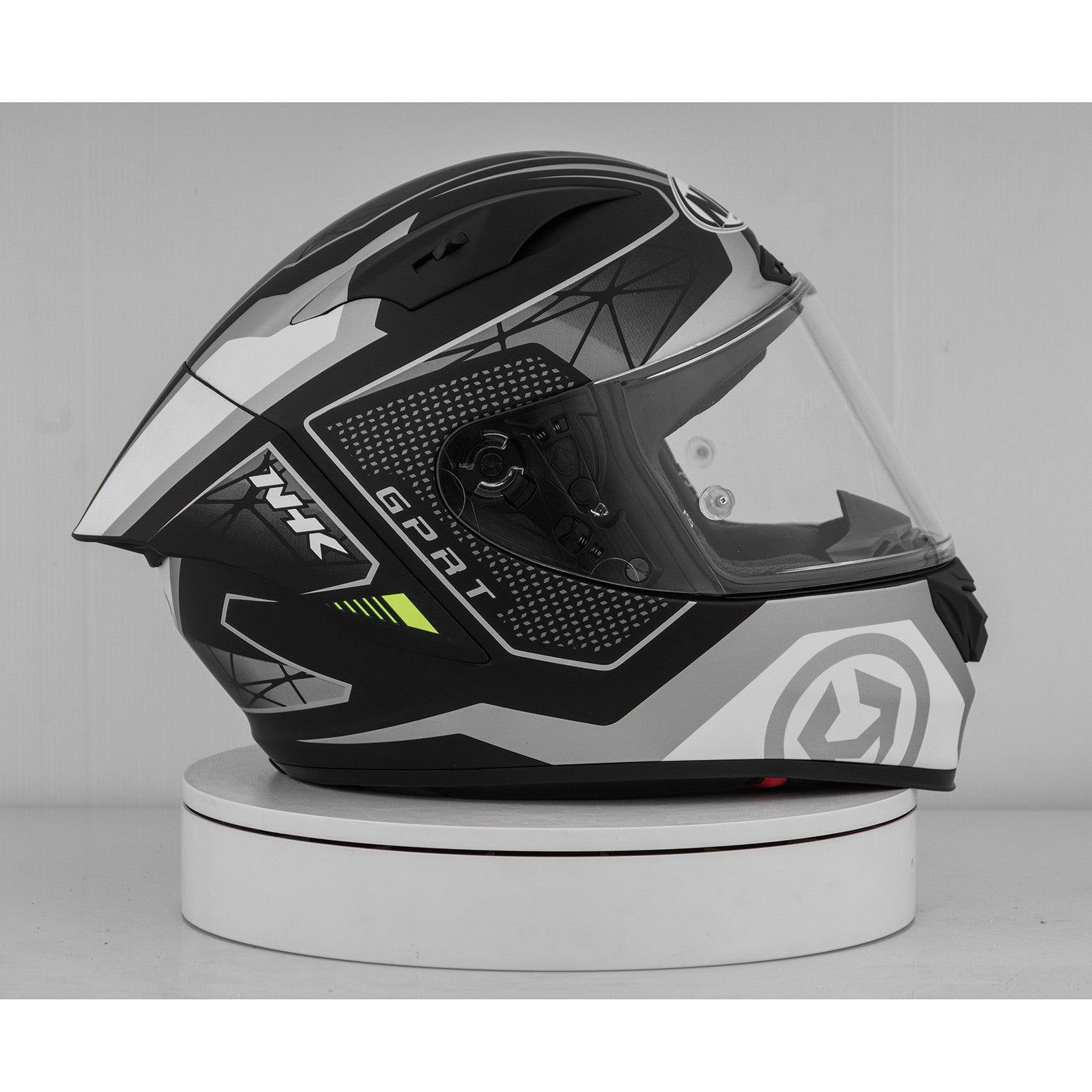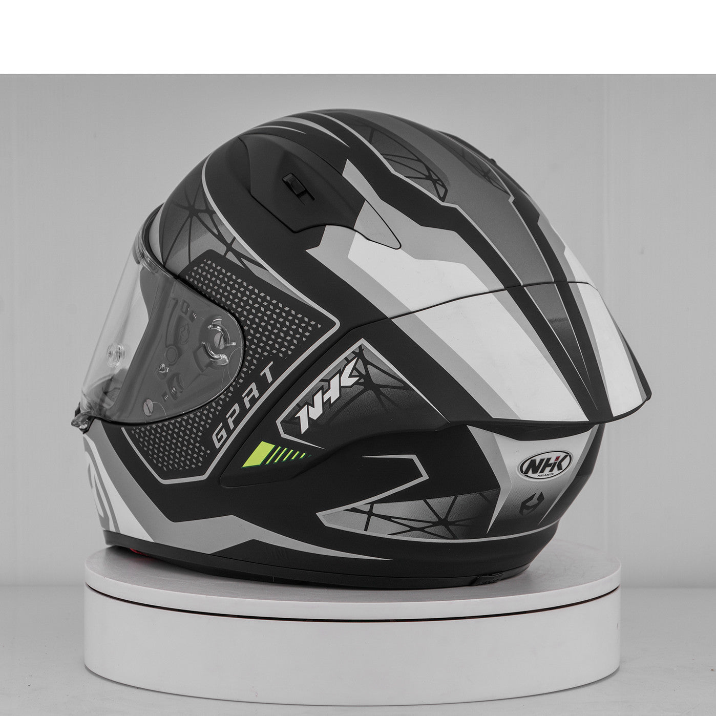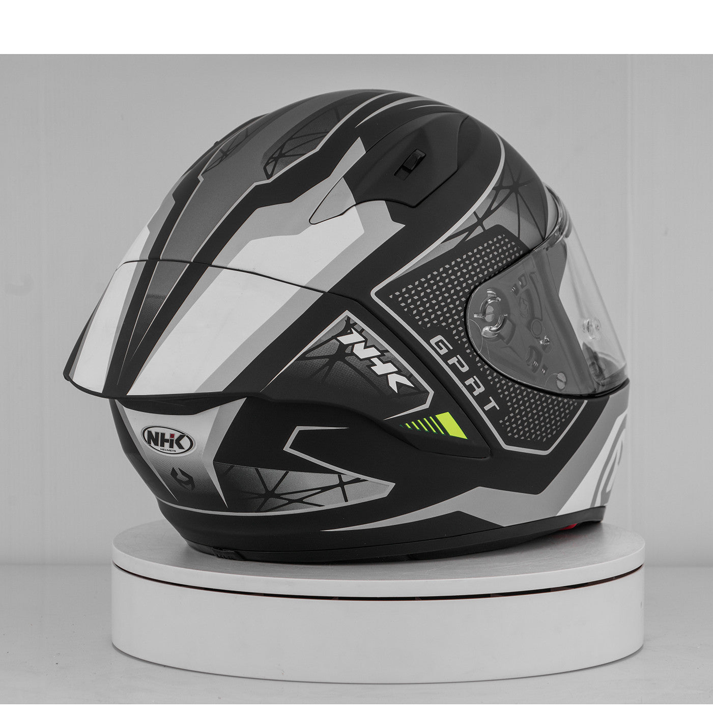 Erleben Sie den ultimativen Motorradhelm mit dem NHK GP-R Tech Race, der FIM-zugelassen ist und eine (AFRC) Advanced Fiberglass Reinforced Composite-Verbundschale in fünf Größen bietet, die perfekte Passform und Schutz garantiert. Der AFRC ist ein Verbundwerkstoff, der aus einer Matrix und Verstärkungsfasern besteht. Die Matrix ist in der Regel ein Polymer (z. B. Epoxidharz), während die Verstärkungsfasern aus Glasfasern bestehen. Mit neun Innenschalengrößen und zwölf Helmgrößen finden Sie immer die ideale Passform. Unser 4D-Air Lüftungssystem sorgt für eine optimale Belüftung und ein angenehmes Tragegefühl, während das Premium und komfortable Innenfutter höchsten Komfort bietet. Der Helm wurde aerodynamisch in den Klassen der MotoGP getestet und verfügt über ein flaches Visier mit "Wide Angle View" für ein erweitertes Sichtfeld. Das Pin-Lock & Tear-off-ready Visier gewährleistet klare Sicht unter allen Bedingungen. Dank des 100% vollmechanischen Visiersystems ist der Wechsel des Visiers einfach und schnell. Das herausnehmbare und waschbare Innenfutter sorgt für einfache Pflege und Hygiene. Der Helm ist zudem vorbereitet für einen "Camel-Bag" und kann problemlos mit Brille getragen werden. Das Doppel-D-Ring-Rückhaltesystem und die Wange zur Notabnahme bieten zusätzliche Sicherheit und Stabilität. Der Helm wurde im Windkanal getestet, um beste Leistung bei hoher Geschwindigkeit zu gewährleisten.