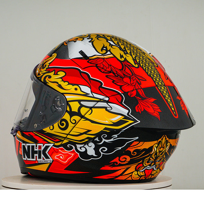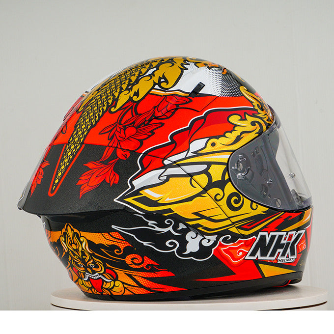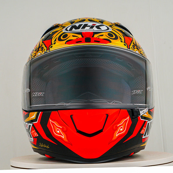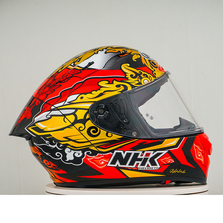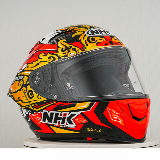 Erleben Sie den ultimativen Motorradhelm mit dem NHK GP-R Tech Race, der FIM-zugelassen ist und eine (AFRC) Advanced Fiberglass Reinforced Composite-Verbundschale in fünf Größen bietet, die perfekte Passform und Schutz garantiert. Der AFRC ist ein Verbundwerkstoff, der aus einer Matrix und Verstärkungsfasern besteht. Die Matrix ist in der Regel ein Polymer (z. B. Epoxidharz), während die Verstärkungsfasern aus Glasfasern bestehen. Mit neun Innenschalengrößen und zwölf Helmgrößen finden Sie immer die ideale Passform. Unser 4D-Air Lüftungssystem sorgt für eine optimale Belüftung und ein angenehmes Tragegefühl, während das Premium und komfortable Innenfutter höchsten Komfort bietet. Der Helm wurde aerodynamisch in den Klassen der MotoGP getestet und verfügt über ein flaches Visier mit "Wide Angle View" für ein erweitertes Sichtfeld. Das Pin-Lock & Tear-off-ready Visier gewährleistet klare Sicht unter allen Bedingungen. Dank des 100% vollmechanischen Visiersystems ist der Wechsel des Visiers einfach und schnell. Das herausnehmbare und waschbare Innenfutter sorgt für einfache Pflege und Hygiene. Der Helm ist zudem vorbereitet für einen "Camel-Bag" und kann problemlos mit Brille getragen werden. Das Doppel-D-Ring-Rückhaltesystem und die Wange zur Notabnahme bieten zusätzliche Sicherheit und Stabilität. Der Helm wurde im Windkanal getestet, um beste Leistung bei hoher Geschwindigkeit zu gewährleisten.