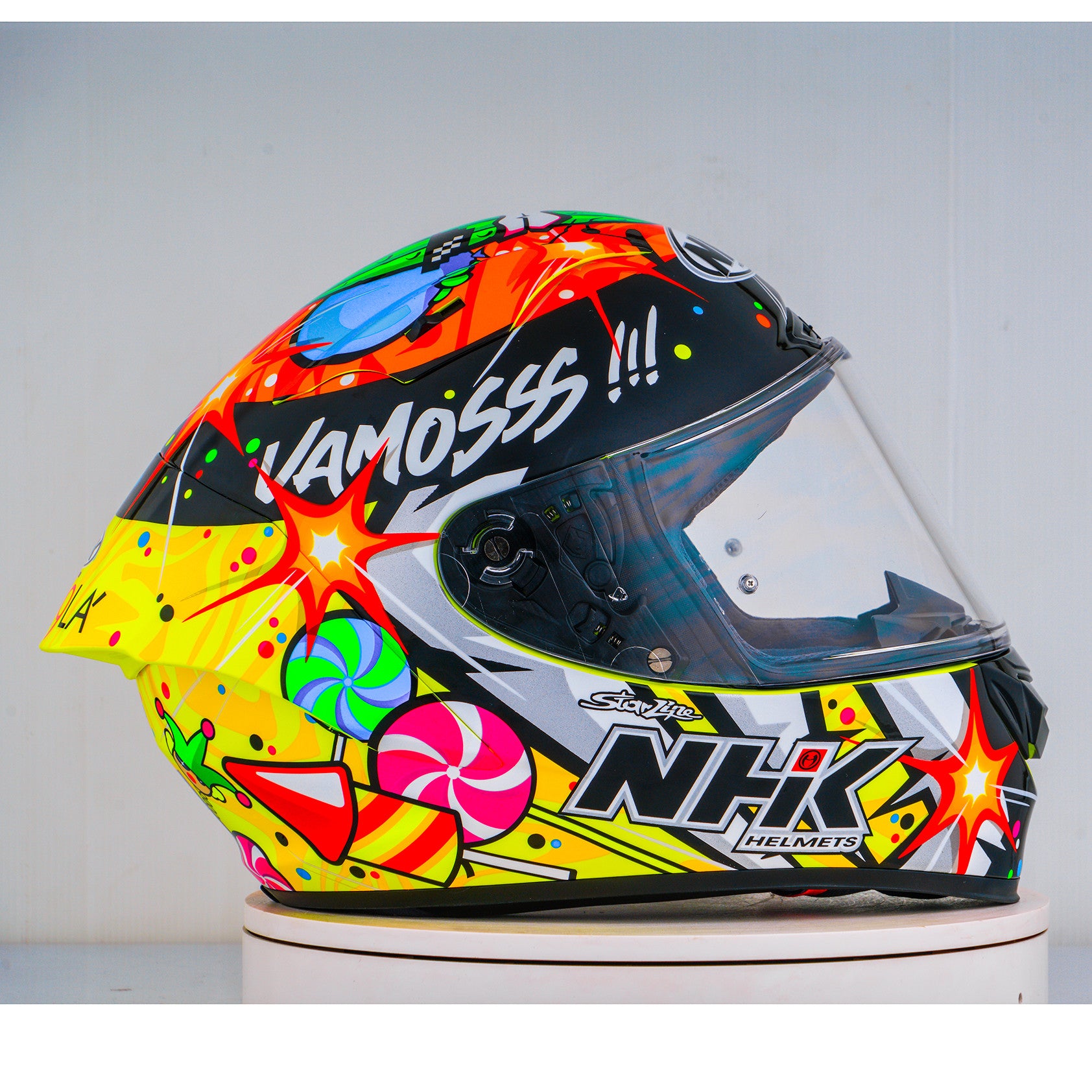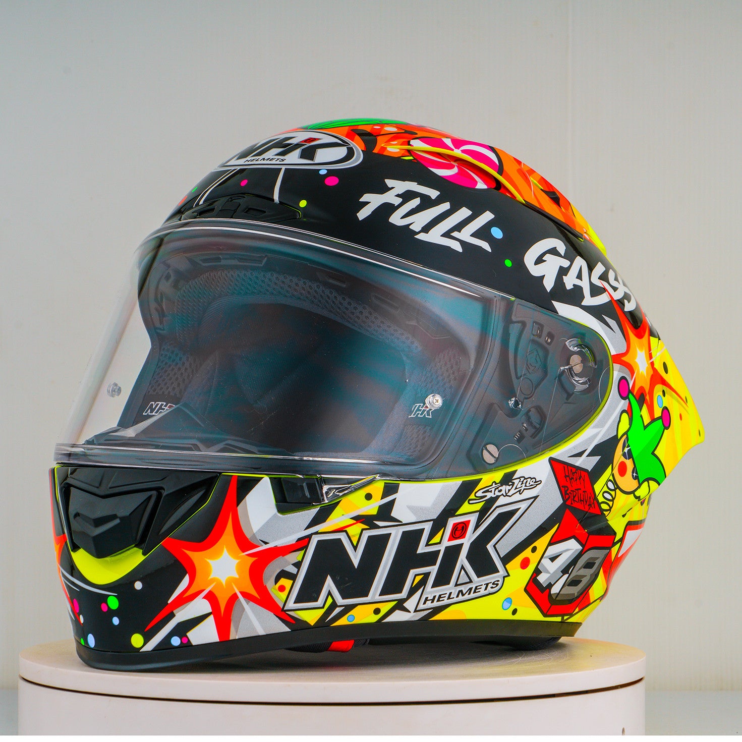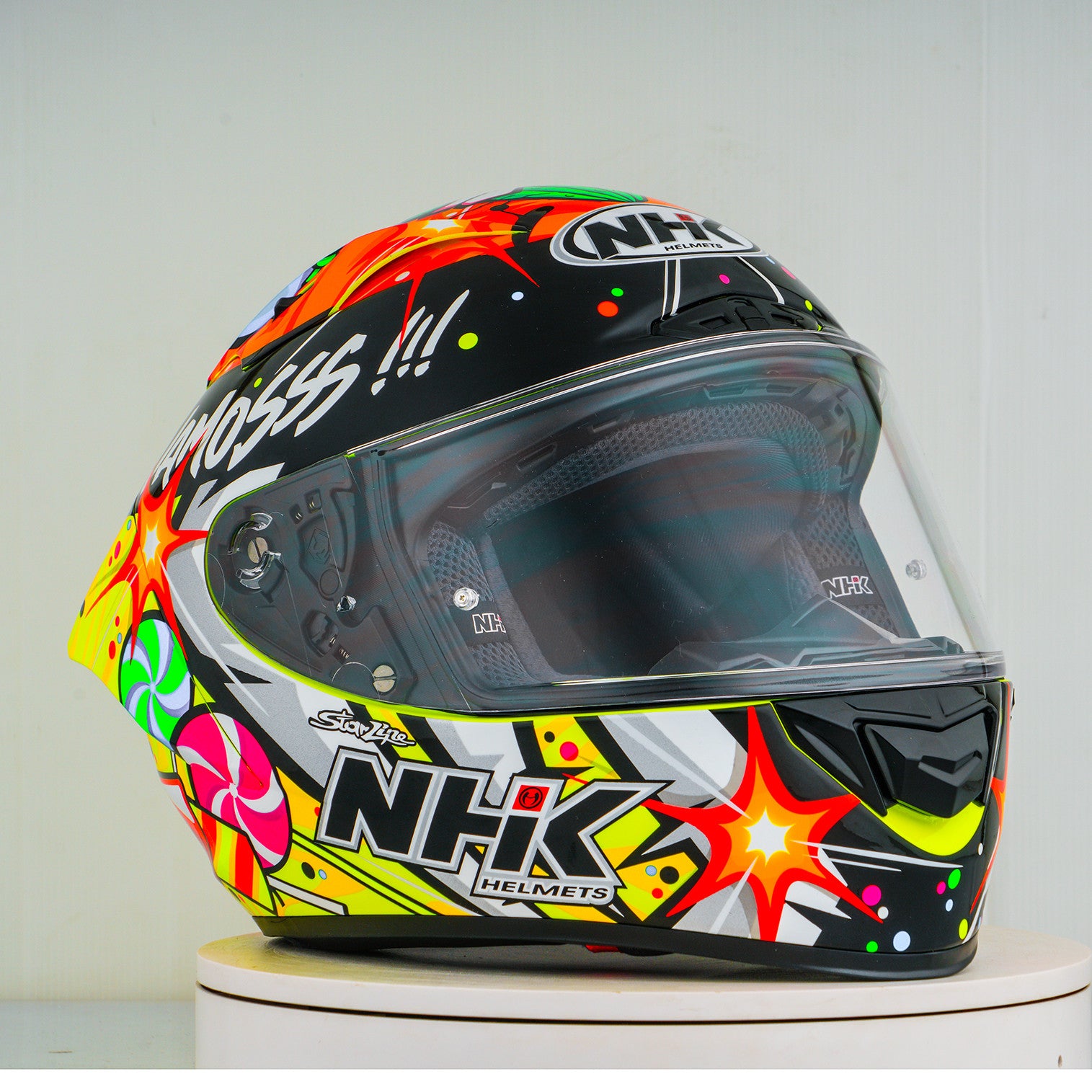 Erleben Sie den ultimativen Motorradhelm mit dem NHK GP-R Tech Race, der FIM-zugelassen ist und eine (AFRC) Advanced Fiberglass Reinforced Composite-Verbundschale in fünf Größen bietet, die perfekte Passform und Schutz garantiert. Der AFRC ist ein Verbundwerkstoff, der aus einer Matrix und Verstärkungsfasern besteht. Die Matrix ist in der Regel ein Polymer (z. B. Epoxidharz), während die Verstärkungsfasern aus Glasfasern bestehen. Mit neun Innenschalengrößen und zwölf Helmgrößen finden Sie immer die ideale Passform. Unser 4D-Air Lüftungssystem sorgt für eine optimale Belüftung und ein angenehmes Tragegefühl, während das Premium und komfortable Innenfutter höchsten Komfort bietet.Der Helm wurde aerodynamisch in den Klassen der MotoGP getestet und verfügt über ein flaches Visier mit "Wide Angle View" für ein erweitertes Sichtfeld. Das Pin-Lock & Tear-off-ready Visier gewährleistet klare Sicht unter allen Bedingungen. Dank des 100% vollmechanischen Visiersystems ist der Wechsel des Visiers einfach und schnell.Das herausnehmbare und waschbare Innenfutter sorgt für einfache Pflege und Hygiene. Der Helm ist zudem vorbereitet für einen "Camel-Bag" und kann problemlos mit Brille getragen werden. Das Doppel-D-Ring-Rückhaltesystem und die Wange zur Notabnahme bieten zusätzliche Sicherheit und Stabilität. Der Helm wurde im Windkanal getestet, um beste Leistung bei hoher Geschwindigkeit zu gewährleisten.
