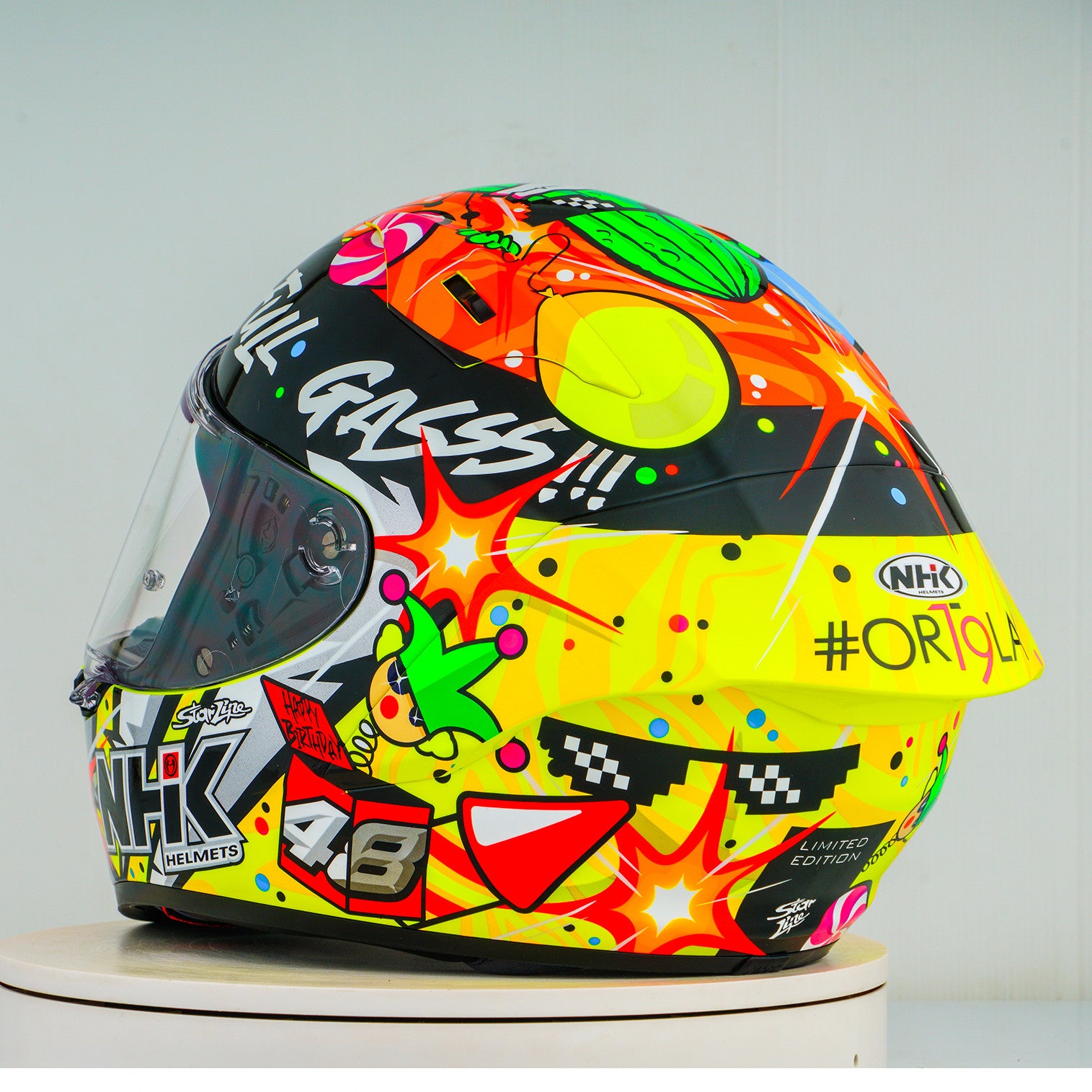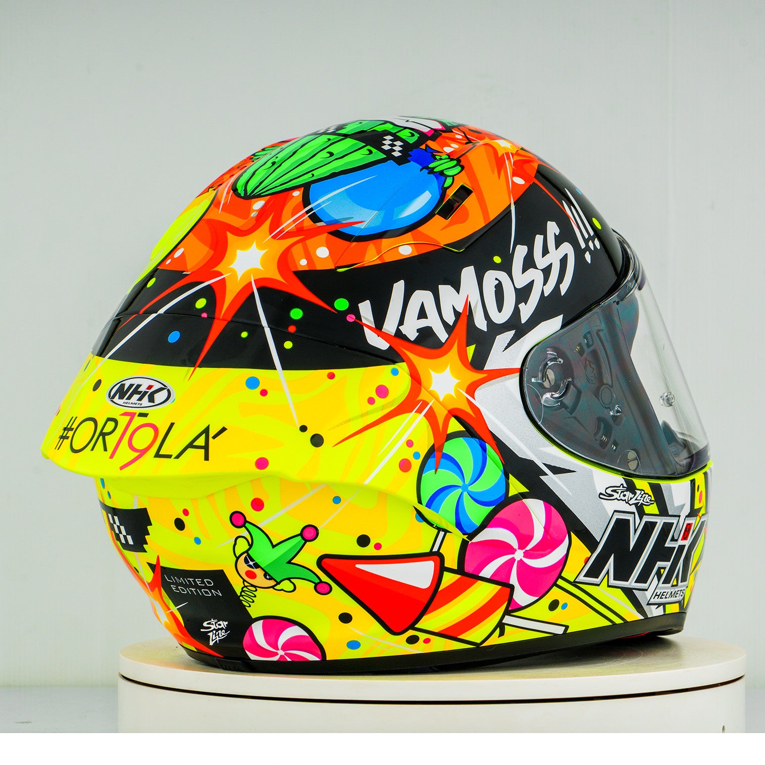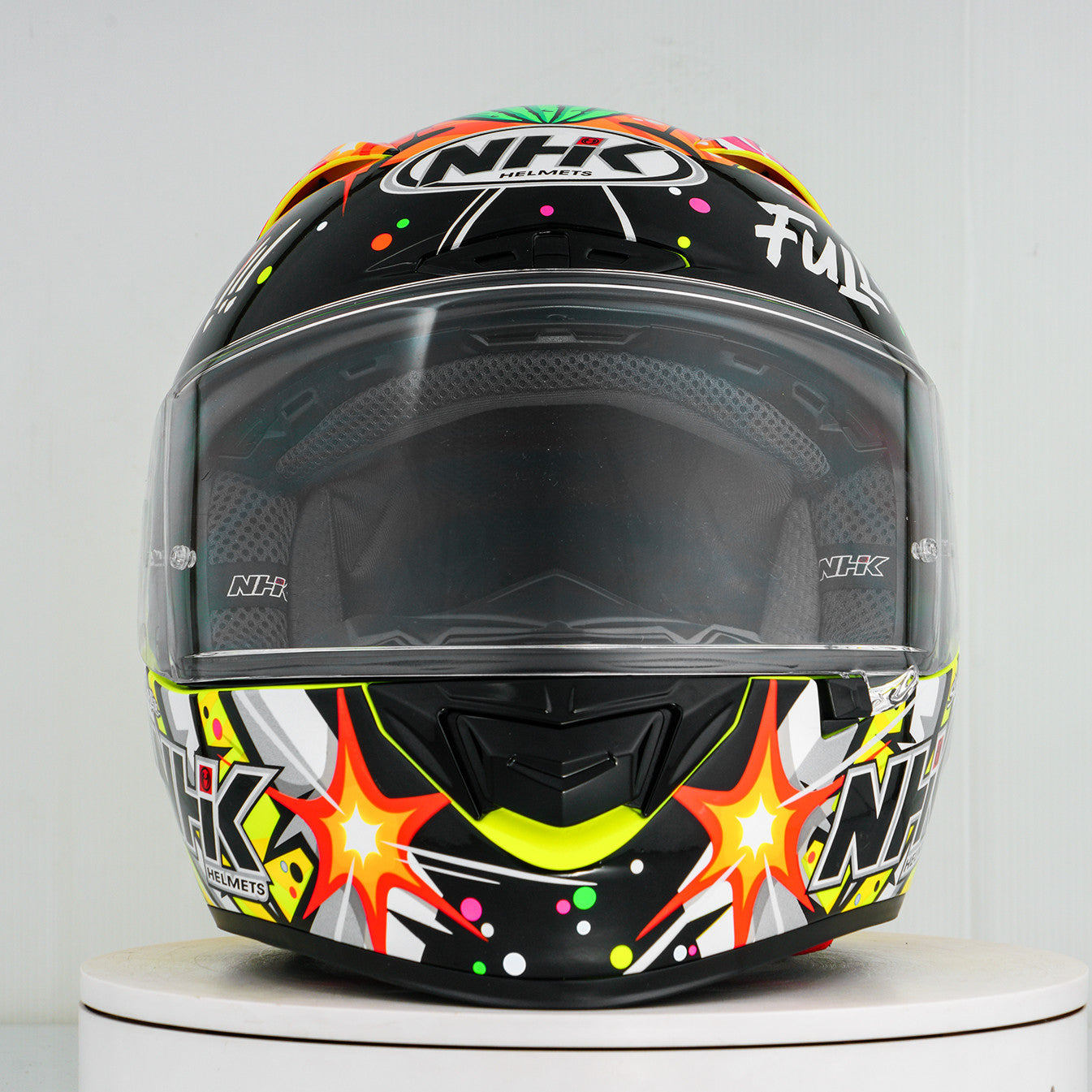 Erleben Sie den ultimativen Motorradhelm mit dem NHK GP-R Tech Race, der FIM-zugelassen ist und eine (AFRC) Advanced Fiberglass Reinforced Composite-Verbundschale in fünf Größen bietet, die perfekte Passform und Schutz garantiert. Der AFRC ist ein Verbundwerkstoff, der aus einer Matrix und Verstärkungsfasern besteht. Die Matrix ist in der Regel ein Polymer (z. B. Epoxidharz), während die Verstärkungsfasern aus Glasfasern bestehen. Mit neun Innenschalengrößen und zwölf Helmgrößen finden Sie immer die ideale Passform. Unser 4D-Air Lüftungssystem sorgt für eine optimale Belüftung und ein angenehmes Tragegefühl, während das Premium und komfortable Innenfutter höchsten Komfort bietet.Der Helm wurde aerodynamisch in den Klassen der MotoGP getestet und verfügt über ein flaches Visier mit "Wide Angle View" für ein erweitertes Sichtfeld. Das Pin-Lock & Tear-off-ready Visier gewährleistet klare Sicht unter allen Bedingungen. Dank des 100% vollmechanischen Visiersystems ist der Wechsel des Visiers einfach und schnell.Das herausnehmbare und waschbare Innenfutter sorgt für einfache Pflege und Hygiene. Der Helm ist zudem vorbereitet für einen "Camel-Bag" und kann problemlos mit Brille getragen werden. Das Doppel-D-Ring-Rückhaltesystem und die Wange zur Notabnahme bieten zusätzliche Sicherheit und Stabilität. Der Helm wurde im Windkanal getestet, um beste Leistung bei hoher Geschwindigkeit zu gewährleisten.