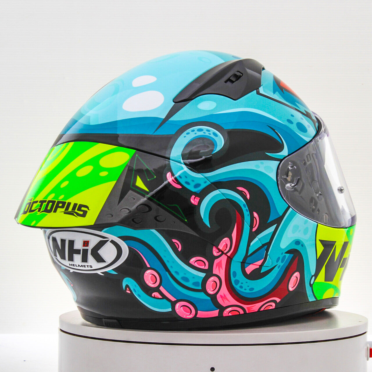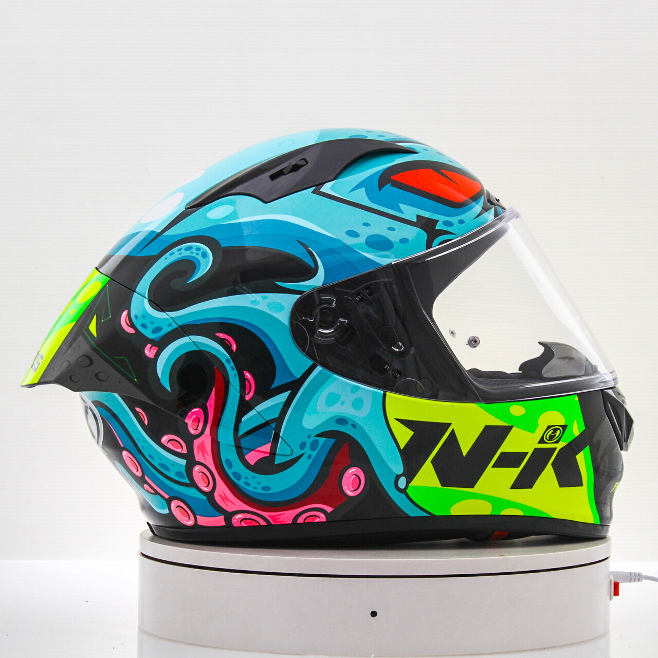 Erleben Sie den ultimativen Motorradhelm mit dem NHK GP-R Tech Race, der FIM-zugelassen ist und eine (AFRC) Advanced Fiberglass Reinforced Composite-Verbundschale in fünf Größen bietet, die perfekte Passform und Schutz garantiert. Der AFRC ist ein Verbundwerkstoff, der aus einer Matrix und Verstärkungsfasern besteht. Die Matrix ist in der Regel ein Polymer (z. B. Epoxidharz), während die Verstärkungsfasern aus Glasfasern bestehen. Mit neun Innenschalengrößen und zwölf Helmgrößen finden Sie immer die ideale Passform. Unser 4D-Air Lüftungssystem sorgt für eine optimale Belüftung und ein angenehmes Tragegefühl, während das Premium und komfortable Innenfutter höchsten Komfort bietet.Der Helm wurde aerodynamisch in den Klassen der MotoGP getestet und verfügt über ein flaches Visier mit "Wide Angle View" für ein erweitertes Sichtfeld. Das Pin-Lock & Tear-off-ready Visier gewährleistet klare Sicht unter allen Bedingungen. Dank des 100% vollmechanischen Visiersystems ist der Wechsel des Visiers einfach und schnell.Das herausnehmbare und waschbare Innenfutter sorgt für einfache Pflege und Hygiene. Der Helm ist zudem vorbereitet für einen "Camel-Bag" und kann problemlos mit Brille getragen werden. Das Doppel-D-Ring-Rückhaltesystem und die Wange zur Notabnahme bieten zusätzliche Sicherheit und Stabilität. Der Helm wurde im Windkanal getestet, um beste Leistung bei hoher Geschwindigkeit zu gewährleisten.