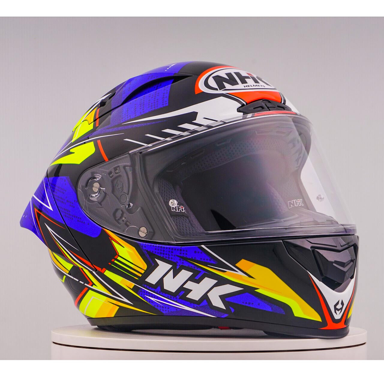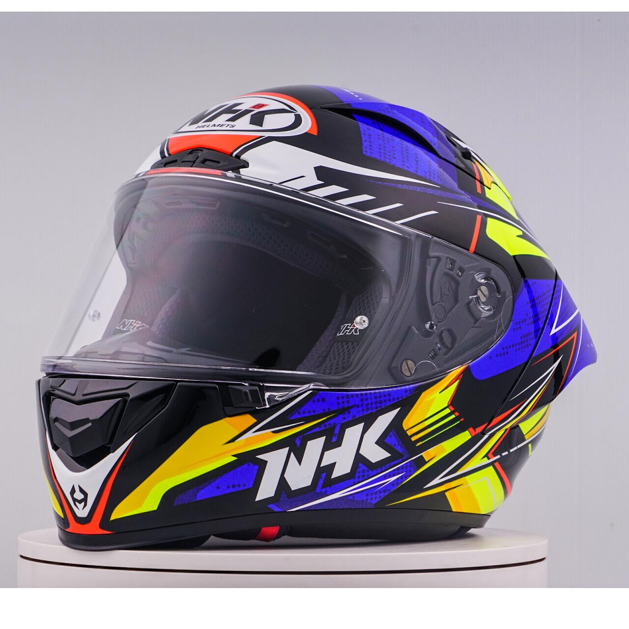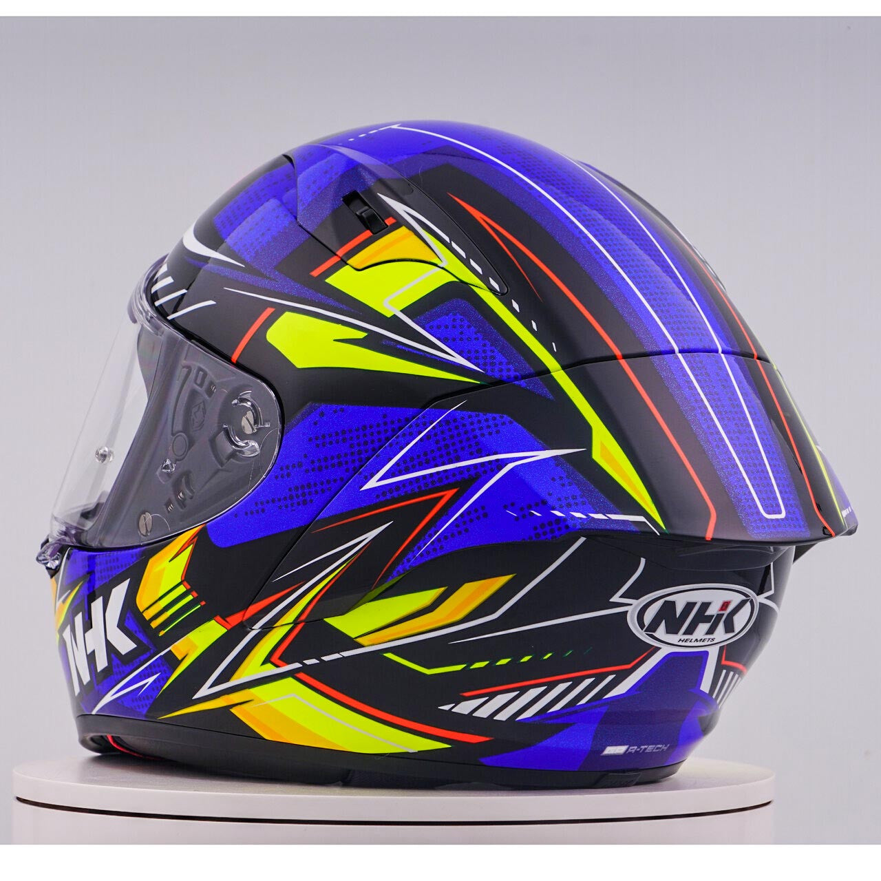 Erleben Sie den ultimativen Motorradhelm mit dem NHK GP-R Tech Race, der FIM-zugelassen ist und eine (AFRC) Advanced Fiberglass Reinforced Composite-Verbundschale in fünf Größen bietet, die perfekte Passform und Schutz garantiert. Der AFRC ist ein Verbundwerkstoff, der aus einer Matrix und Verstärkungsfasern besteht. Die Matrix ist in der Regel ein Polymer (z. B. Epoxidharz), während die Verstärkungsfasern aus Glasfasern bestehen. Mit neun Innenschalengrößen und zwölf Helmgrößen finden Sie immer die ideale Passform. Unser 4D-Air Lüftungssystem sorgt für eine optimale Belüftung und ein angenehmes Tragegefühl, während das Premium und komfortable Innenfutter höchsten Komfort bietet. Der Helm wurde aerodynamisch in den Klassen der MotoGP getestet und verfügt über ein flaches Visier mit "Wide Angle View" für ein erweitertes Sichtfeld. Das Pin-Lock & Tear-off-ready Visier gewährleistet klare Sicht unter allen Bedingungen. Dank des 100% vollmechanischen Visiersystems ist der Wechsel des Visiers einfach und schnell. Das herausnehmbare und waschbare Innenfutter sorgt für einfache Pflege und Hygiene. Der Helm ist zudem vorbereitet für einen "Camel-Bag" und kann problemlos mit Brille getragen werden. Das Doppel-D-Ring-Rückhaltesystem und die Wange zur Notabnahme bieten zusätzliche Sicherheit und Stabilität. Der Helm wurde im Windkanal getestet, um beste Leistung bei hoher Geschwindigkeit zu gewährleisten.