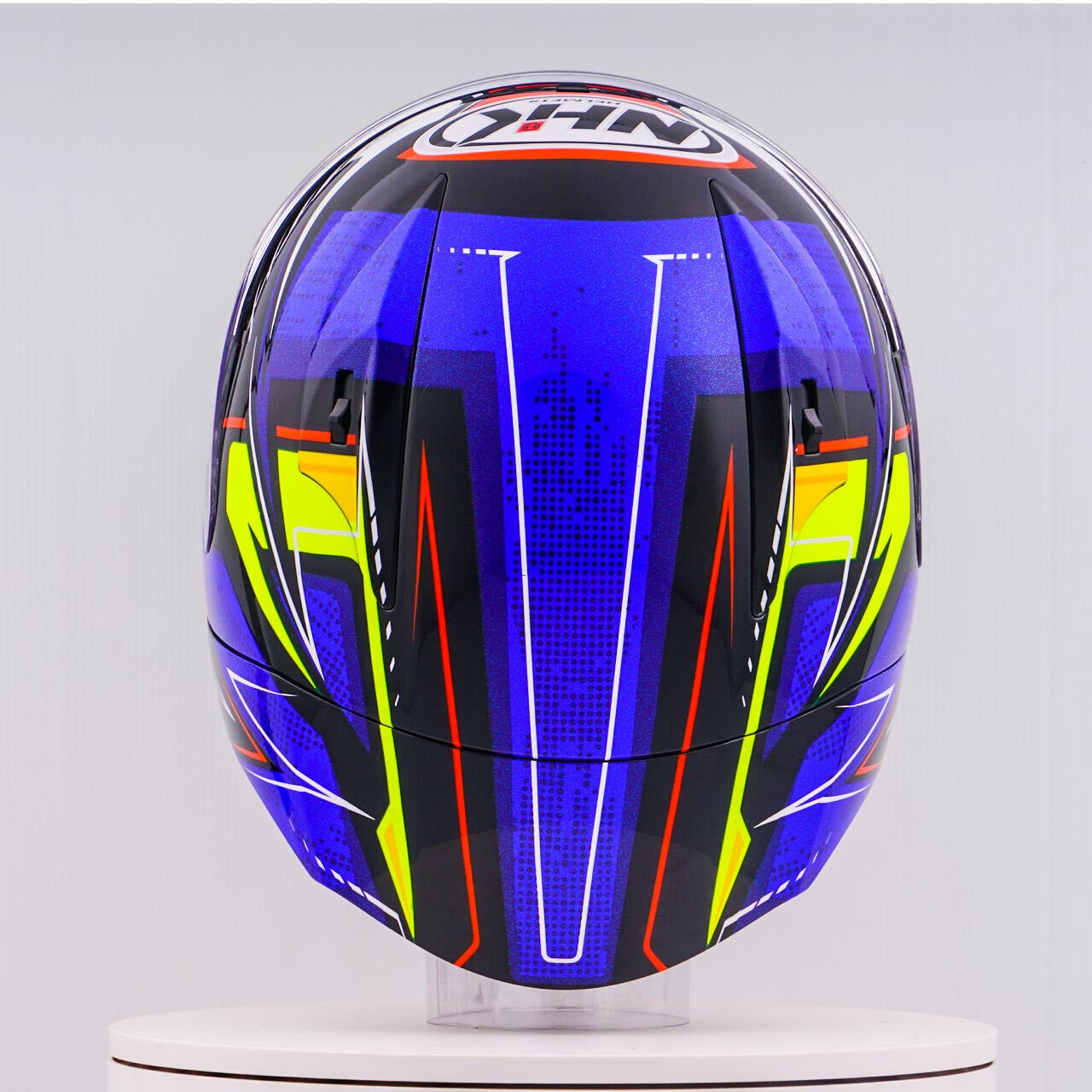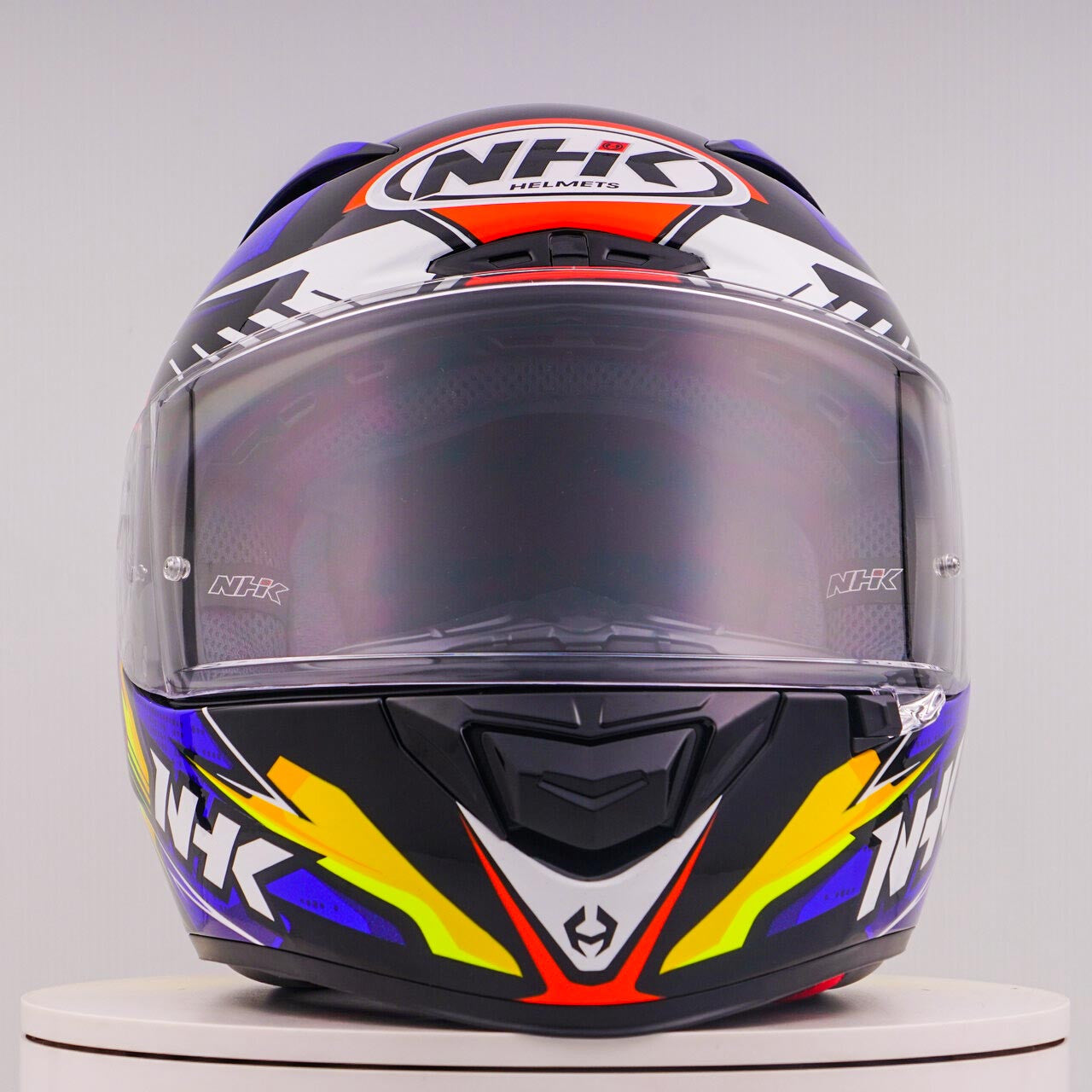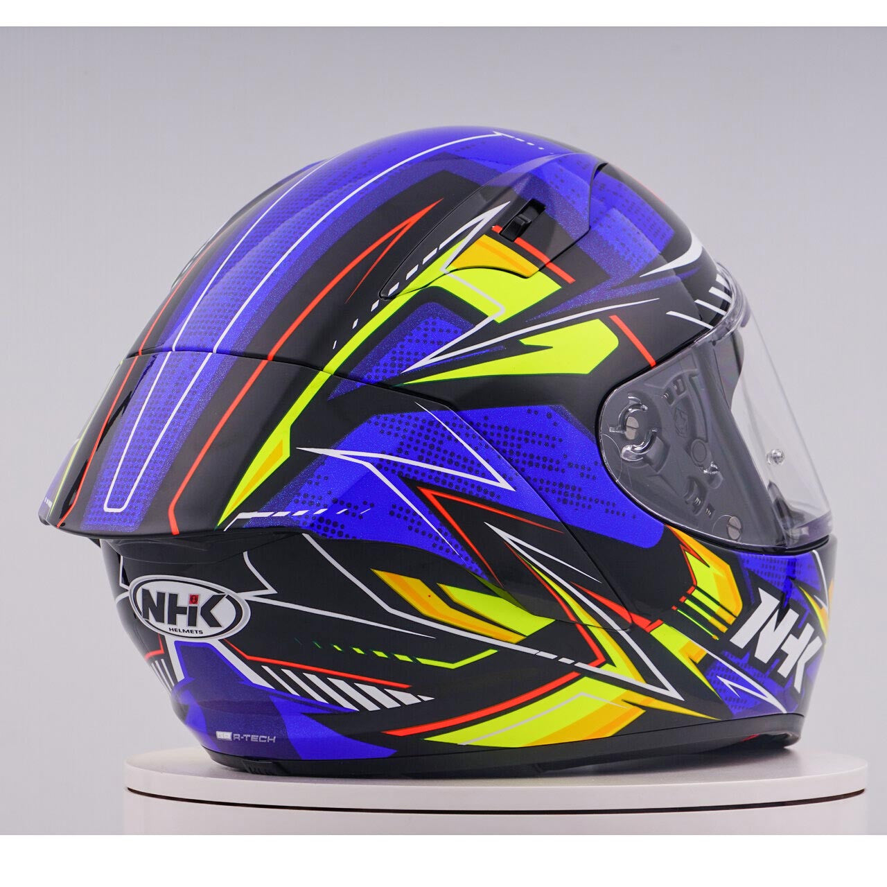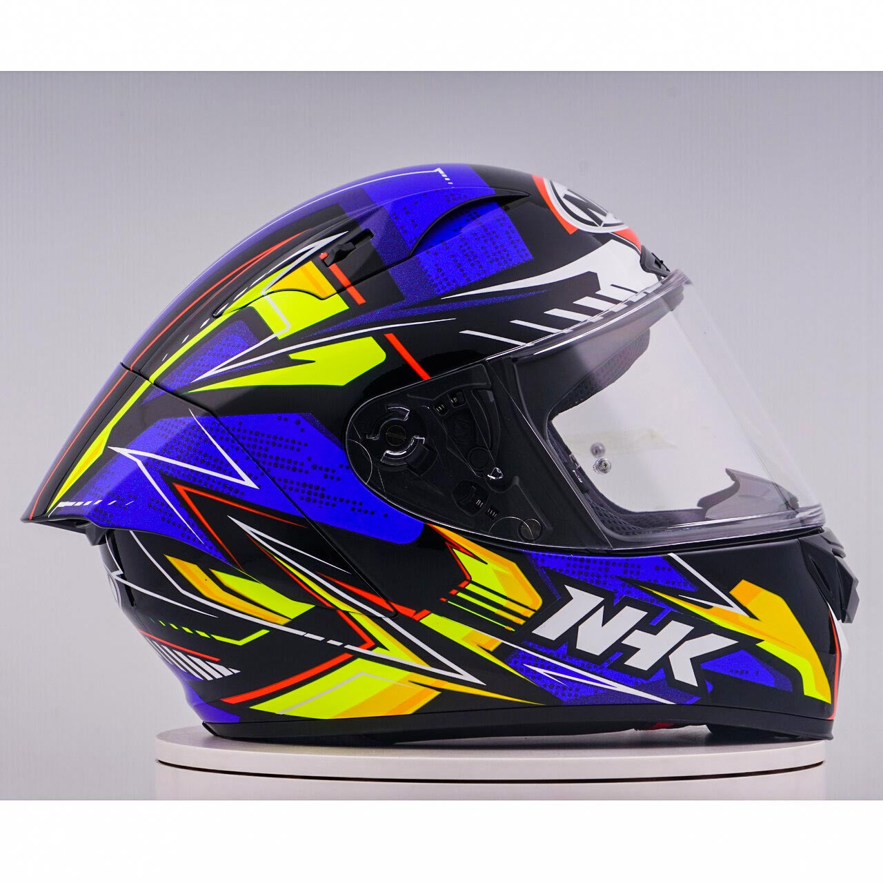 Erleben Sie den ultimativen Motorradhelm mit dem NHK GP-R Tech Race, der FIM-zugelassen ist und eine (AFRC) Advanced Fiberglass Reinforced Composite-Verbundschale in fünf Größen bietet, die perfekte Passform und Schutz garantiert. Der AFRC ist ein Verbundwerkstoff, der aus einer Matrix und Verstärkungsfasern besteht. Die Matrix ist in der Regel ein Polymer (z. B. Epoxidharz), während die Verstärkungsfasern aus Glasfasern bestehen. Mit neun Innenschalengrößen und zwölf Helmgrößen finden Sie immer die ideale Passform. Unser 4D-Air Lüftungssystem sorgt für eine optimale Belüftung und ein angenehmes Tragegefühl, während das Premium und komfortable Innenfutter höchsten Komfort bietet. Der Helm wurde aerodynamisch in den Klassen der MotoGP getestet und verfügt über ein flaches Visier mit "Wide Angle View" für ein erweitertes Sichtfeld. Das Pin-Lock & Tear-off-ready Visier gewährleistet klare Sicht unter allen Bedingungen. Dank des 100% vollmechanischen Visiersystems ist der Wechsel des Visiers einfach und schnell. Das herausnehmbare und waschbare Innenfutter sorgt für einfache Pflege und Hygiene. Der Helm ist zudem vorbereitet für einen "Camel-Bag" und kann problemlos mit Brille getragen werden. Das Doppel-D-Ring-Rückhaltesystem und die Wange zur Notabnahme bieten zusätzliche Sicherheit und Stabilität. Der Helm wurde im Windkanal getestet, um beste Leistung bei hoher Geschwindigkeit zu gewährleisten.