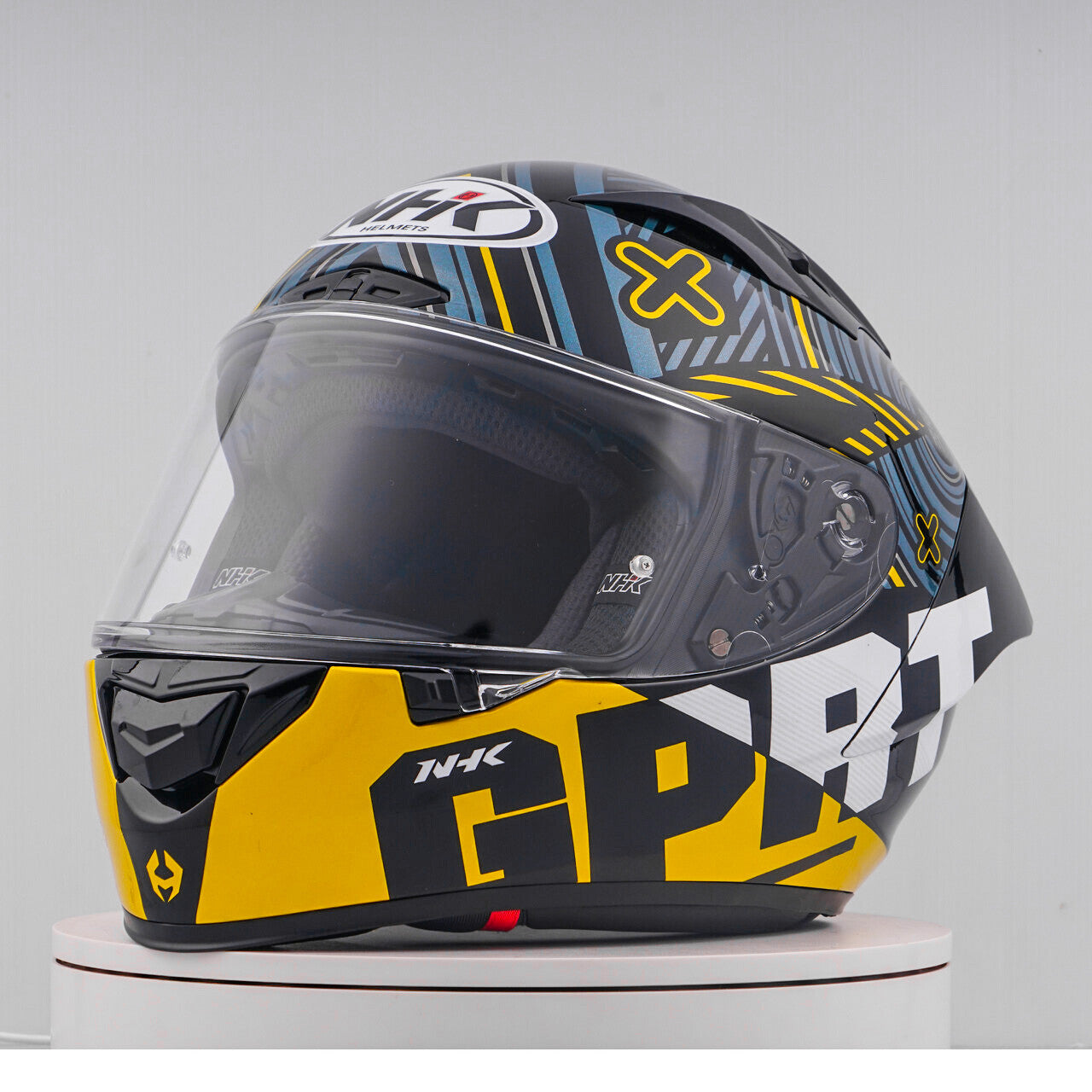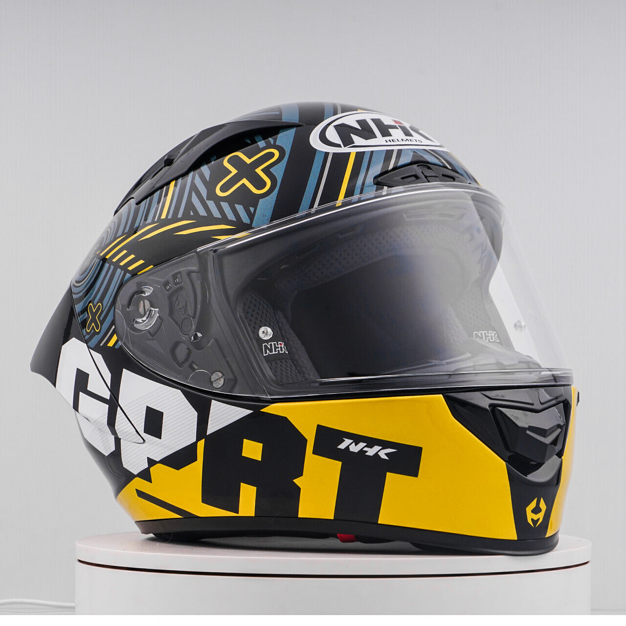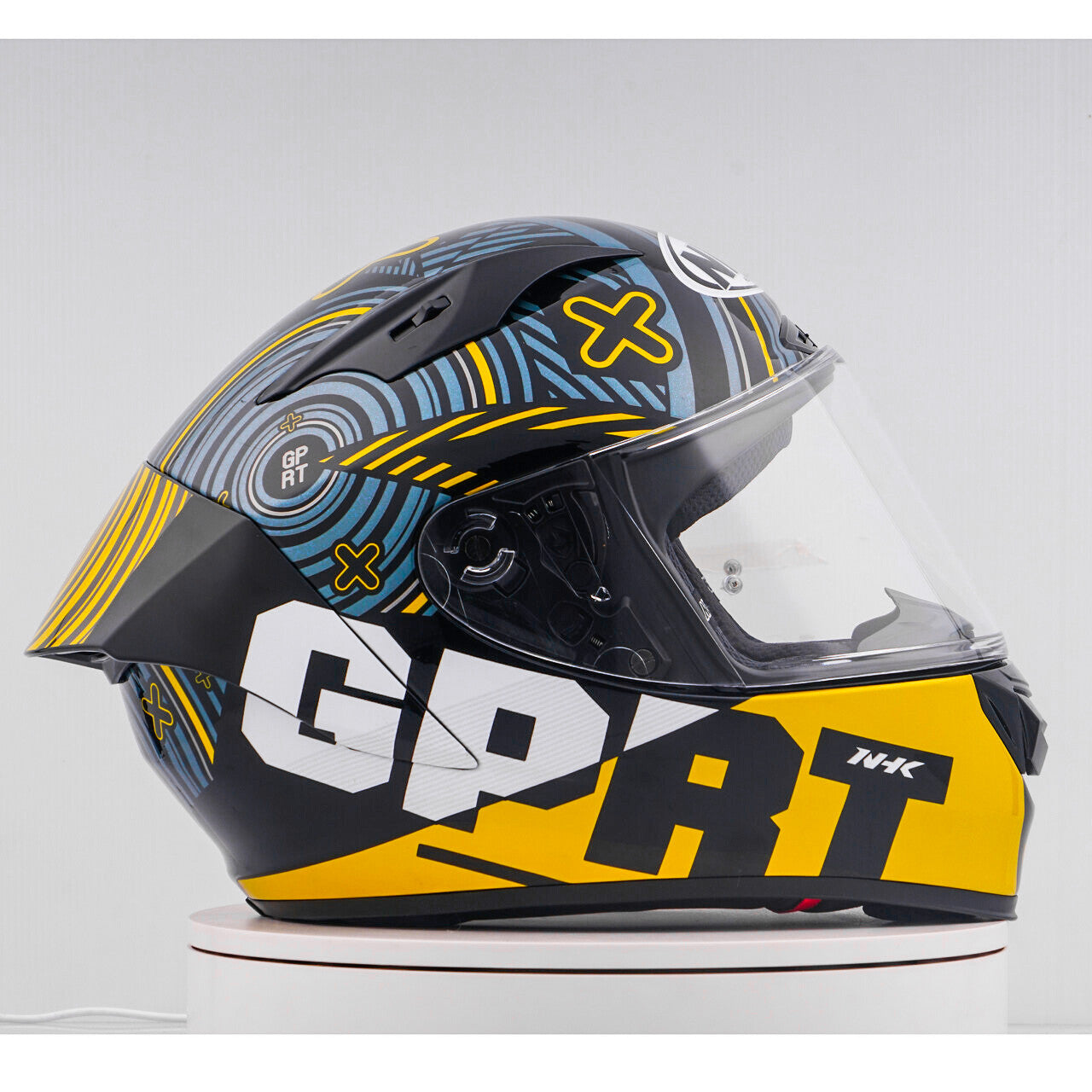 Erleben Sie den ultimativen Motorradhelm mit dem NHK GP-R Tech Race, der FIM-zugelassen ist und eine (AFRC) Advanced Fiberglass Reinforced Composite-Verbundschale in fünf Größen bietet, die perfekte Passform und Schutz garantiert. Der AFRC ist ein Verbundwerkstoff, der aus einer Matrix und Verstärkungsfasern besteht. Die Matrix ist in der Regel ein Polymer (z. B. Epoxidharz), während die Verstärkungsfasern aus Glasfasern bestehen. Mit neun Innenschalengrößen und zwölf Helmgrößen finden Sie immer die ideale Passform. Unser 4D-Air Lüftungssystem sorgt für eine optimale Belüftung und ein angenehmes Tragegefühl, während das Premium und komfortable Innenfutter höchsten Komfort bietet. Der Helm wurde aerodynamisch in den Klassen der MotoGP getestet und verfügt über ein flaches Visier mit "Wide Angle View" für ein erweitertes Sichtfeld. Das Pin-Lock & Tear-off-ready Visier gewährleistet klare Sicht unter allen Bedingungen. Dank des 100% vollmechanischen Visiersystems ist der Wechsel des Visiers einfach und schnell. Das herausnehmbare und waschbare Innenfutter sorgt für einfache Pflege und Hygiene. Der Helm ist zudem vorbereitet für einen "Camel-Bag" und kann problemlos mit Brille getragen werden. Das Doppel-D-Ring-Rückhaltesystem und die Wange zur Notabnahme bieten zusätzliche Sicherheit und Stabilität. Der Helm wurde im Windkanal getestet, um beste Leistung bei hoher Geschwindigkeit zu gewährleisten.