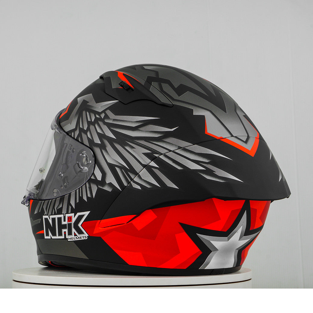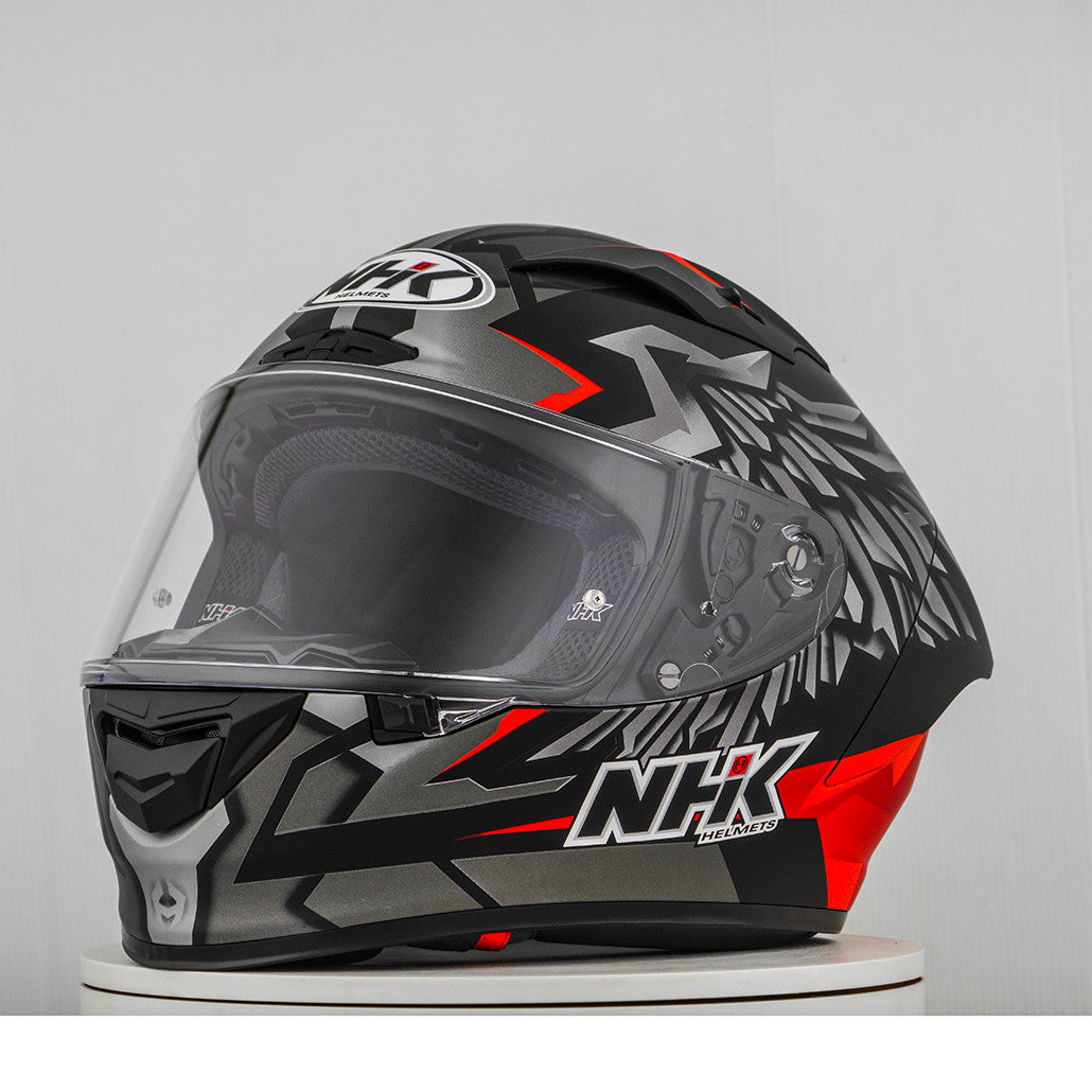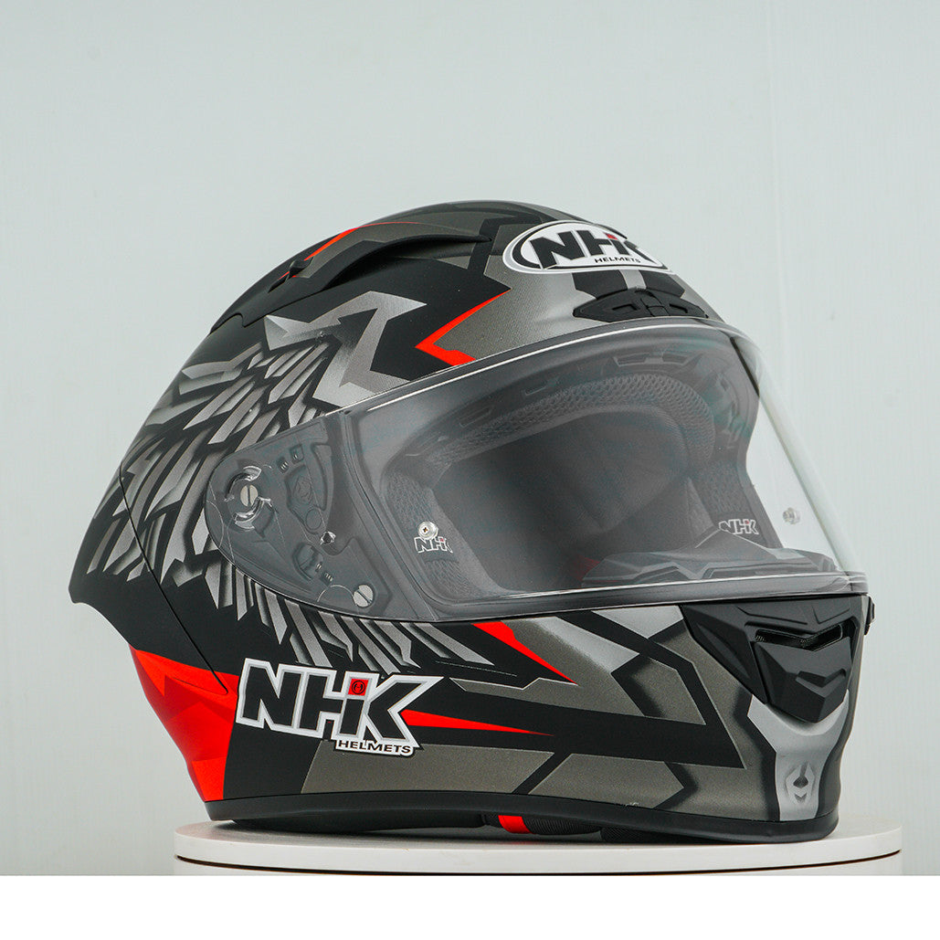 Erleben Sie den ultimativen Motorradhelm mit dem NHK GP-R Tech Race, der FIM-zugelassen ist und eine (AFRC) Advanced Fiberglass Reinforced Composite-Verbundschale in fünf Größen bietet, die perfekte Passform und Schutz garantiert. Der AFRC ist ein Verbundwerkstoff, der aus einer Matrix und Verstärkungsfasern besteht. Die Matrix ist in der Regel ein Polymer (z. B. Epoxidharz), während die Verstärkungsfasern aus Glasfasern bestehen. Mit neun Innenschalengrößen und zwölf Helmgrößen finden Sie immer die ideale Passform. Unser 4D-Air Lüftungssystem sorgt für eine optimale Belüftung und ein angenehmes Tragegefühl, während das Premium und komfortable Innenfutter höchsten Komfort bietet. Der Helm wurde aerodynamisch in den Klassen der MotoGP getestet und verfügt über ein flaches Visier mit "Wide Angle View" für ein erweitertes Sichtfeld. Das Pin-Lock & Tear-off-ready Visier gewährleistet klare Sicht unter allen Bedingungen. Dank des 100% vollmechanischen Visiersystems ist der Wechsel des Visiers einfach und schnell. Das herausnehmbare und waschbare Innenfutter sorgt für einfache Pflege und Hygiene. Der Helm ist zudem vorbereitet für einen "Camel-Bag" und kann problemlos mit Brille getragen werden. Das Doppel-D-Ring-Rückhaltesystem und die Wange zur Notabnahme bieten zusätzliche Sicherheit und Stabilität. Der Helm wurde im Windkanal getestet, um beste Leistung bei hoher Geschwindigkeit zu gewährleisten.