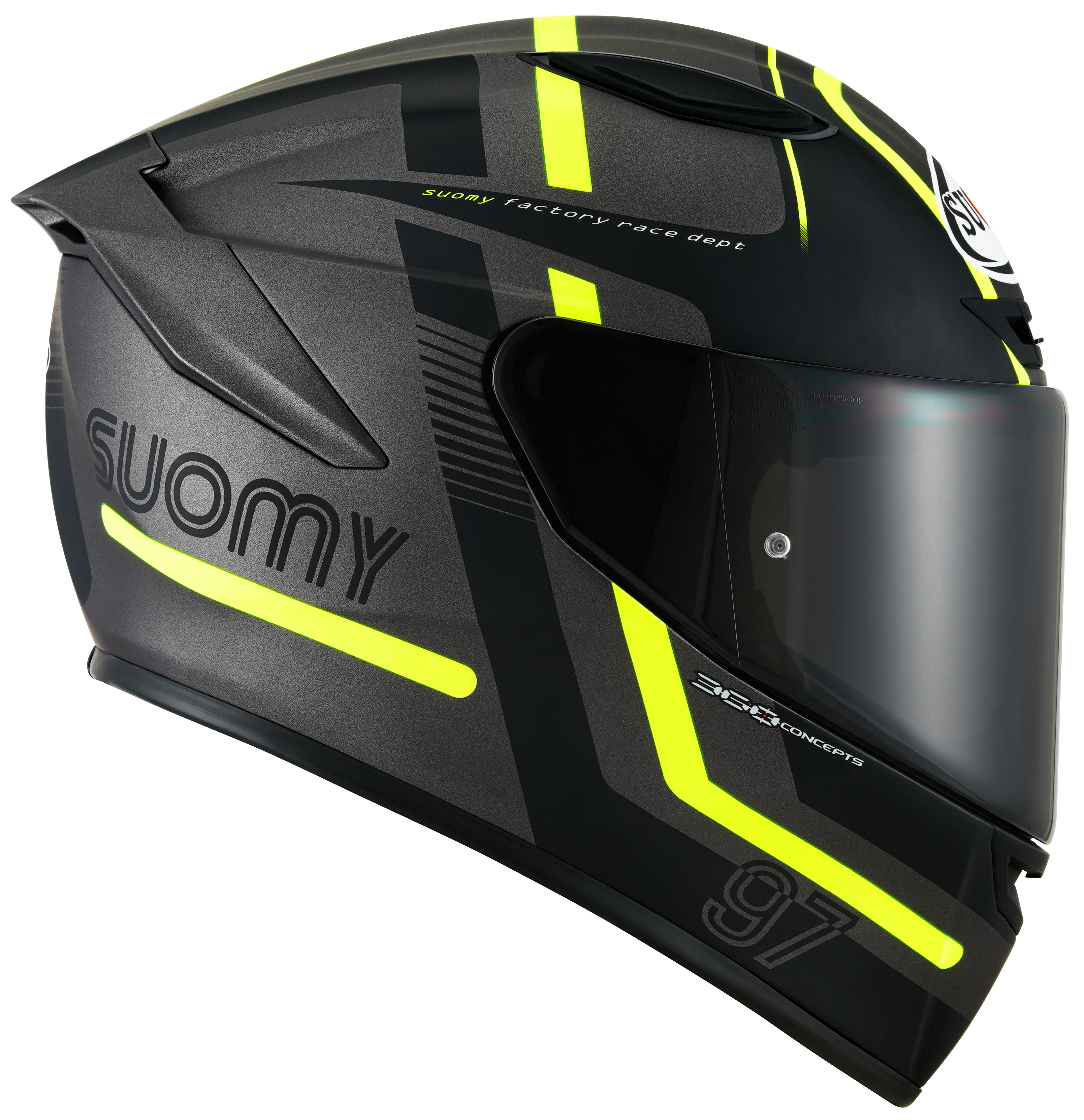 Der Suomy Track-1 Helm Ninety Seven Matt Gun Metal/Gelb kombiniert fortschrittliche Technologie mit maximaler Sicherheit und beispielloser Leichtigkeit. Mit seiner Tricarboco-Faser Außenschale und der Tri-Fiber-Verbundschale bietet dieser Helm außergewöhnlichen Schutz und Leistung, sowohl auf der Rennstrecke als auch im Straßenverkehr. Das markante Design in Gun Metal und Gelb sorgt nicht nur für einen sportlichen Look, sondern bietet auch exzellente Funktionalität.